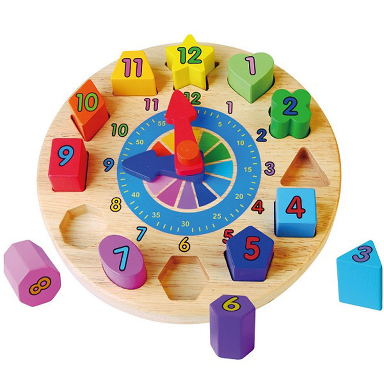 Знакомить ребенка с математикой и понятием времени удобно с объемными часами-вкладышами «Геофигуры». На деревянном циферблате расположились по порядку цифры от 1 до 12. Каждой цифре соответствует уникальная геометрическая фигура. Также фигурки отличаются по цвету. Игрушка имеет вращающиеся стрелки, чтобы ребенок мог самостоятельно «устанавливать» время. Сделать это можно и без съемных вкладышей из рамки, поскольку разметка циферблата нанесена на твердое основание.
