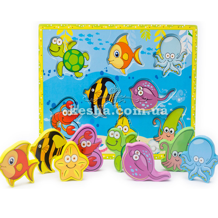 Забавные обитатели морских глубин понравятся малышу яркими цветами, добрыми глазами и приятной фактурой натурального дерева. Фигурки достаточно легкие для игры и достаточно тяжелые, чтобы крепко стоять на горизонтальной поверхности. Спрут, черепашка, разноцветные рыбки живут в плотной красочной рамке с углублениями. Задача малыша – вытащить забавных персонажей, а в конце игры поставить их на место. То задание, с которым пятилетний ребенок справится за 10 секунд, может потребовать у годовалого малыша долгих раздумий и наблюдательности. Но наступит момент, когда он самостоятельно выполнит весь процесс от выемки фигурок до расстановки по местам. Это будет его маленькой победой над формами и цветами.