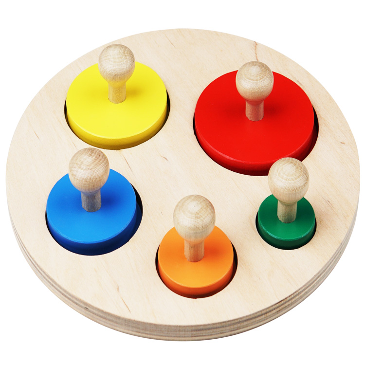 Учимся разбираться в понятиях размера, «больше-меньше», «маленький-средний-большой» и т.д. На деревянном основании размещено 5 вкладышей с большой удобной ручкой в виде кругов разного цвета и диаметра. Для каждого круга есть свое место, которое определяется размером и цветом внутри ячейки.