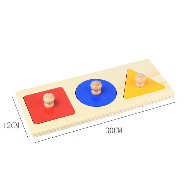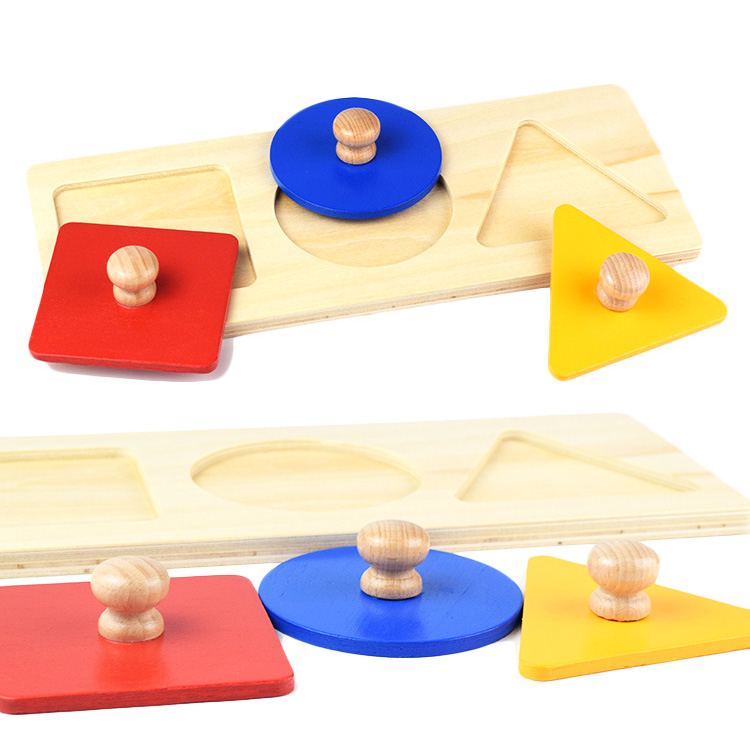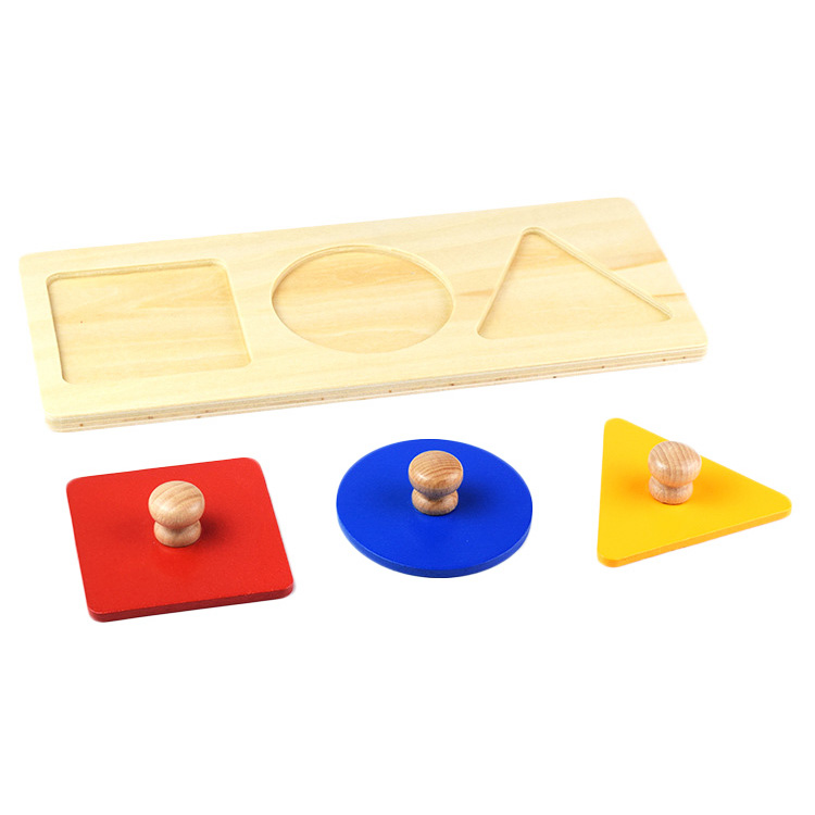 Вкладыши в виде геометрических фигур большого размера с удобной деревянной ручкой. Вкладыши представлены следующими фигурами треугольником, кругом и квадратом.
