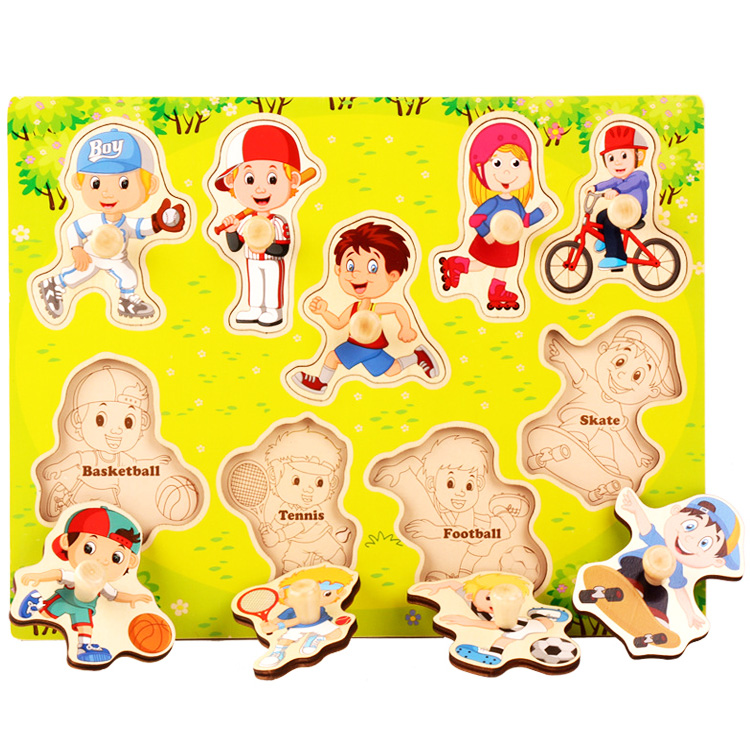 Вкладыши с изображением различных видов спорта: бейсбол, бег, катание на роликах, велоспорт, катание на скейте, баскетбол, теннис, футбол. Всего 9 вкладышей. Играя, расскажите ребенку о данных видах спорта.
