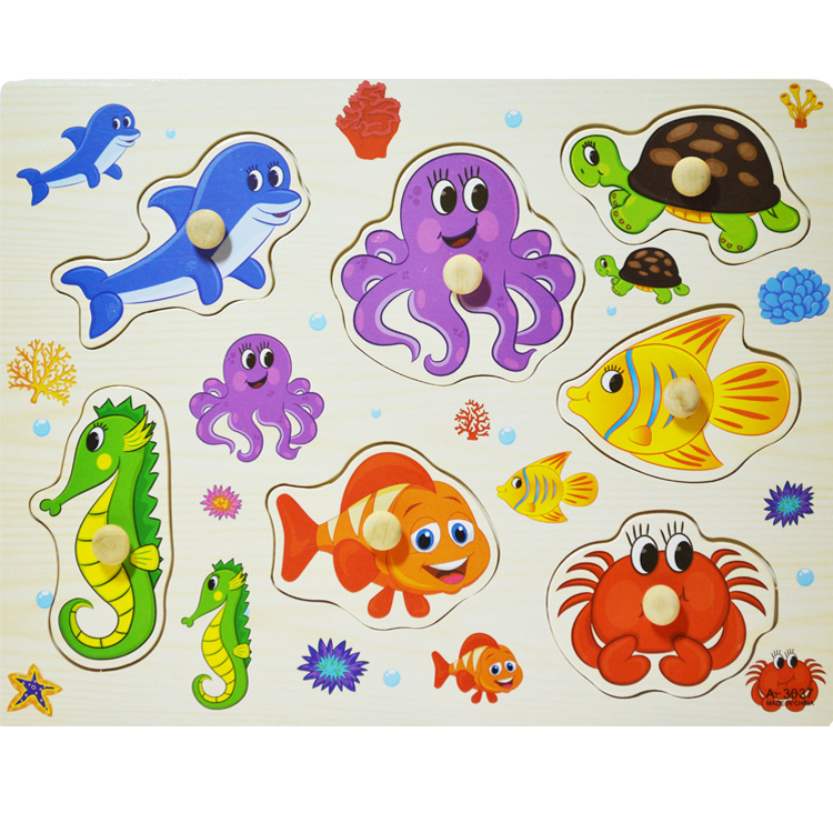 Деревянные вкладыши с изображением разноцветных рыбок и других жителей подводных глубин.