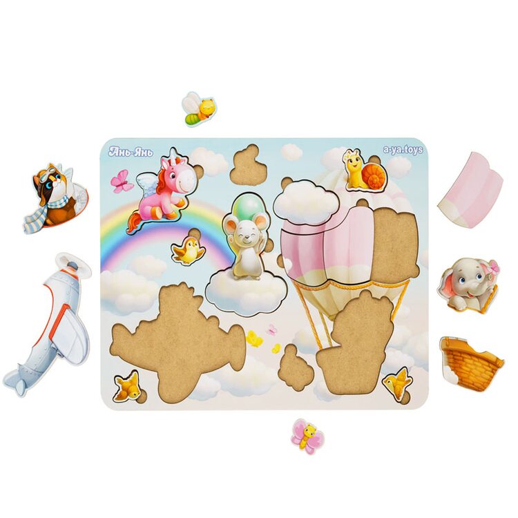 Детские зефирные вкладыши выполнены в приятной цветовой гамме с изображением различных няшных животных, которые катаются на пушистых облаках. Возле каждого вкладыша есть специальная выемка для пальчика, чтобы было удобно доставать животных со своих ячеек.