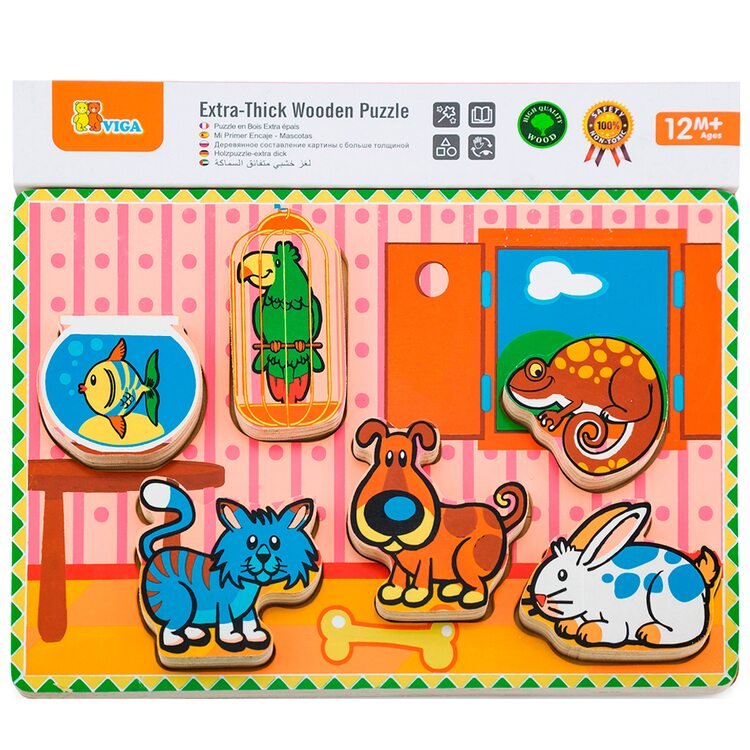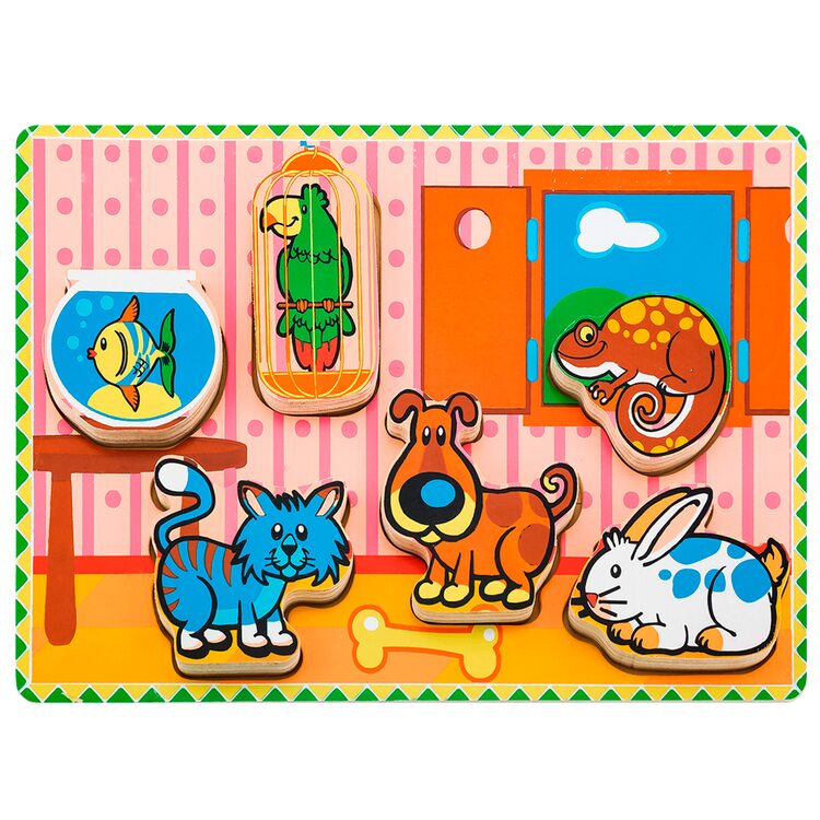 Вкладыши для самых маленьких с большими, объемными деталями . На вкладышах изображены домашние любимцы- животные, которые могут жить в доме: рыбка, котенок, песик, кролик, попугай и ящерка. Вкладышами можно играть отдельно, как полноценными фигурками животных. Толщина вкладышей 1,5 см.