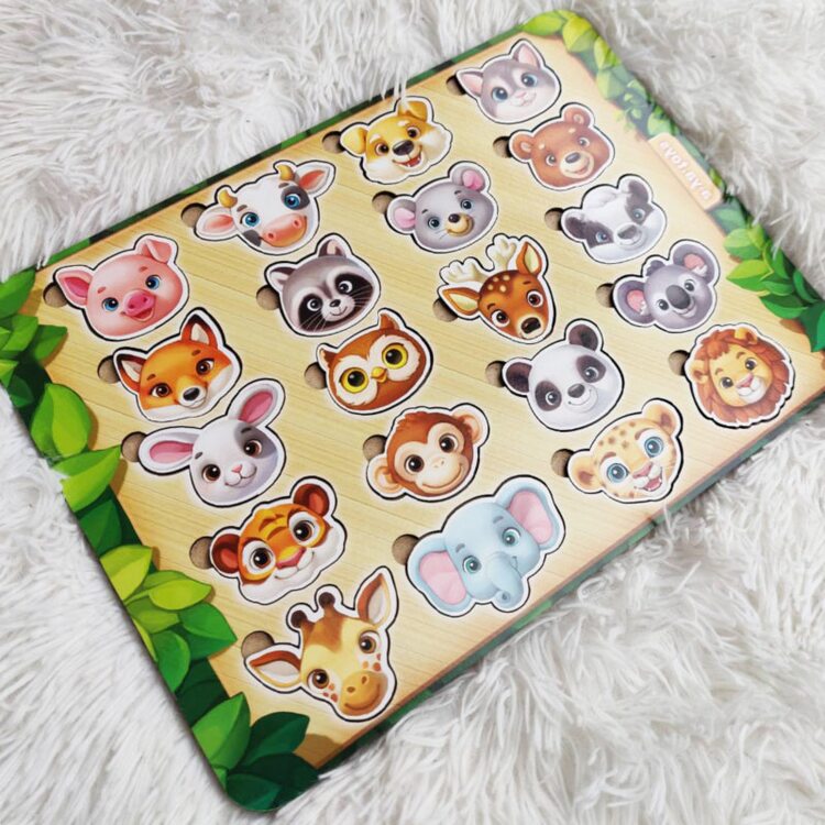 Уникальный в своем роде вкладыш. Ведь большинство детей при определении животных ориентируется по туловищу, окраске, размеру, а вот "в лицо" мало кто их знает. Подходит для более старших детей, потому что нам пока только нравится рассматривать симпатичные мордочки, но пока мы никого не узнали)) |