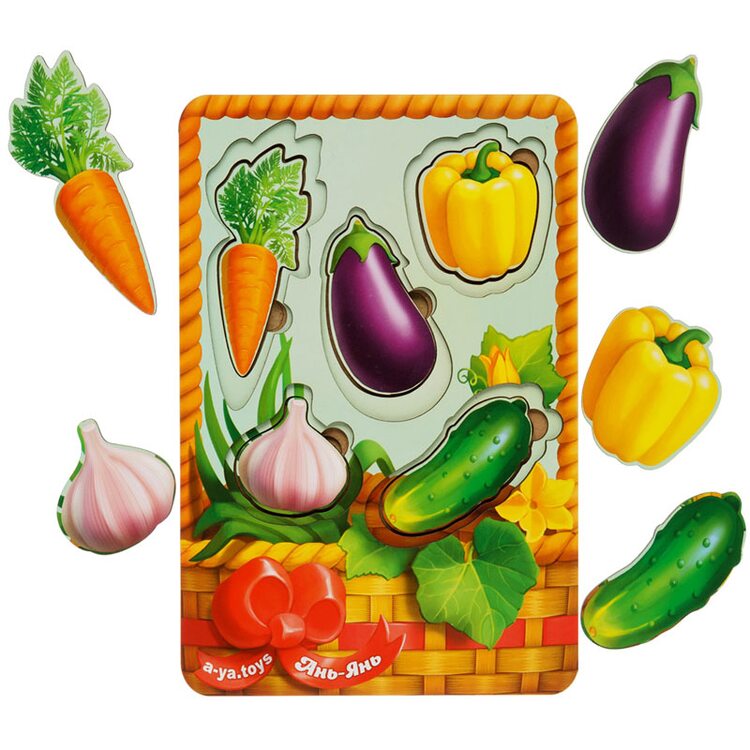 Вкладыши в виде овощей наглядно познакомят Вашего ребенка с овощами. На рамке представлены 5 видов овощей 3-х размеров (всего 15 вкладышей): огурец, чеснок, баклажан, перец и морковка. Вставляя фигурки на деревянную основу, малыш знакомится с формами, развивает координацию, точность, пространственное мышление, разберётся в понятиях "больше-меньше".