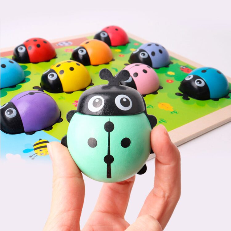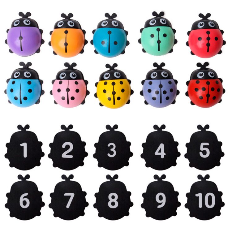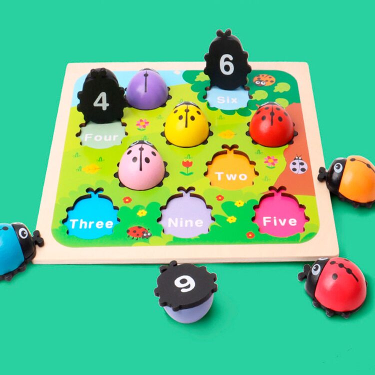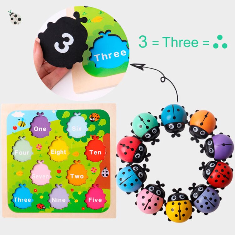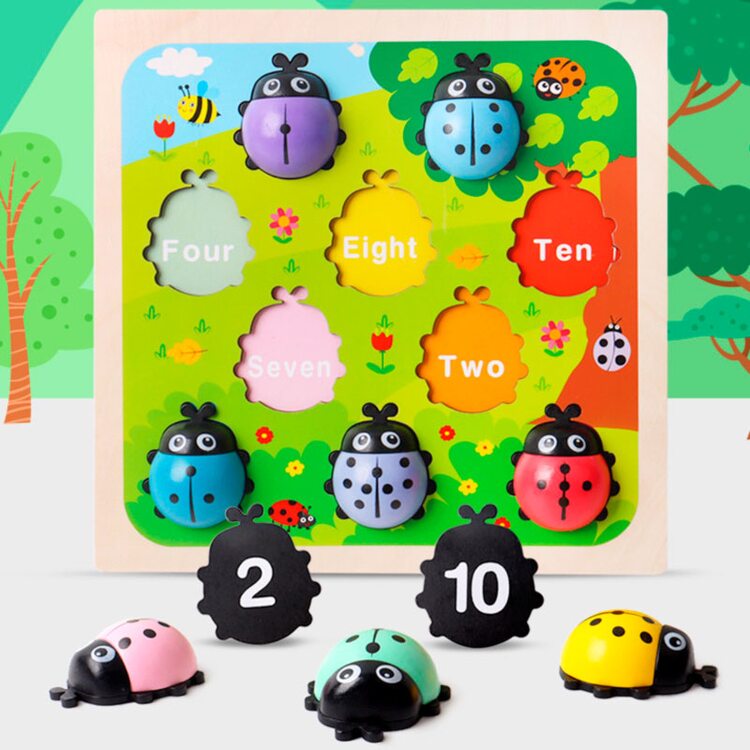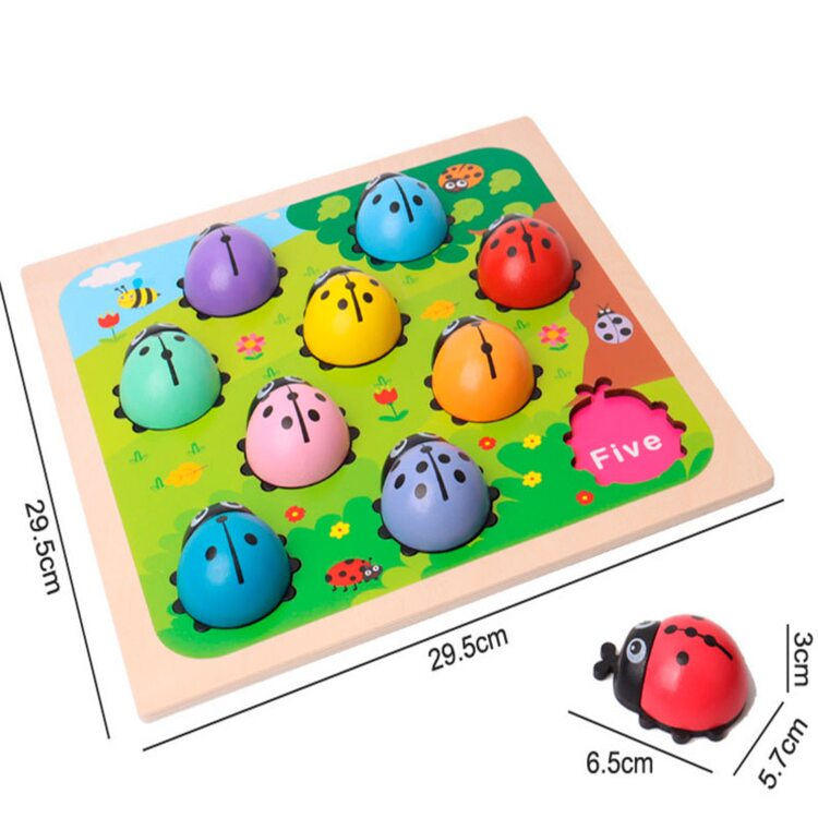 Рамка с объемными вкладышами в виде цветных божьих коровок, которые помогут выучить цифры. Милые букашки помогут малышу научится считать в пределах 10. На каждом жучке нарисовано то количество точек, которое соответствует нарисованной под ним цифре, а также надписи цифры на основании на английском языке.