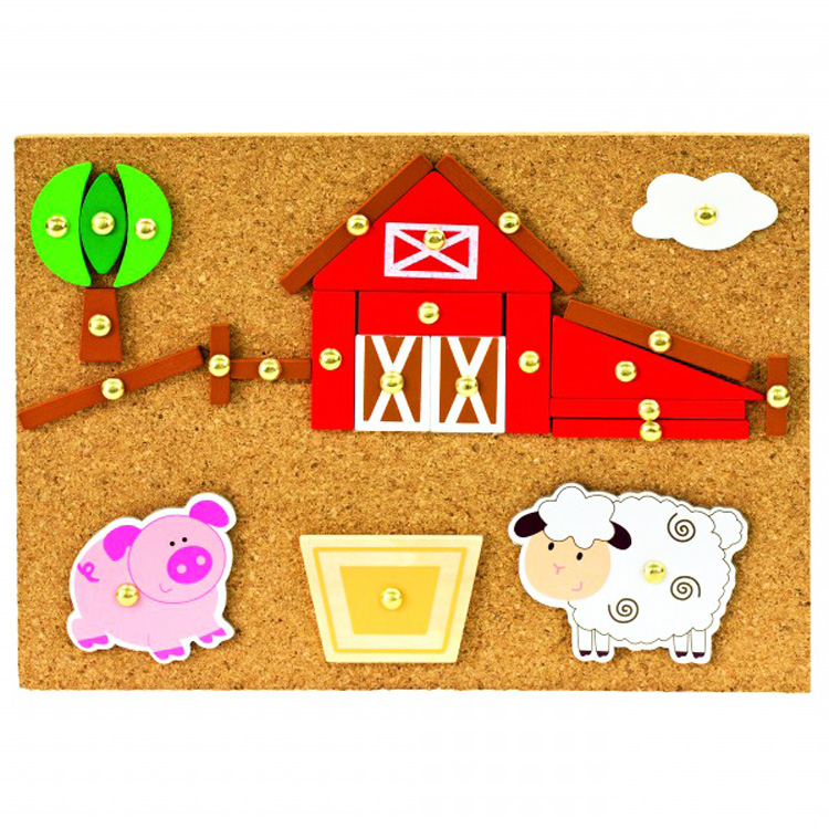 Набор деревянных деталей по тематике фермерское хозяйство. Для получения аппликации детали нужно выкладывать на корковую поверхность и фиксировать специальными гвоздика с молоточком (входят в набор). В набор также входят примеры рисунков, которые можно выложить (8 рисунков).