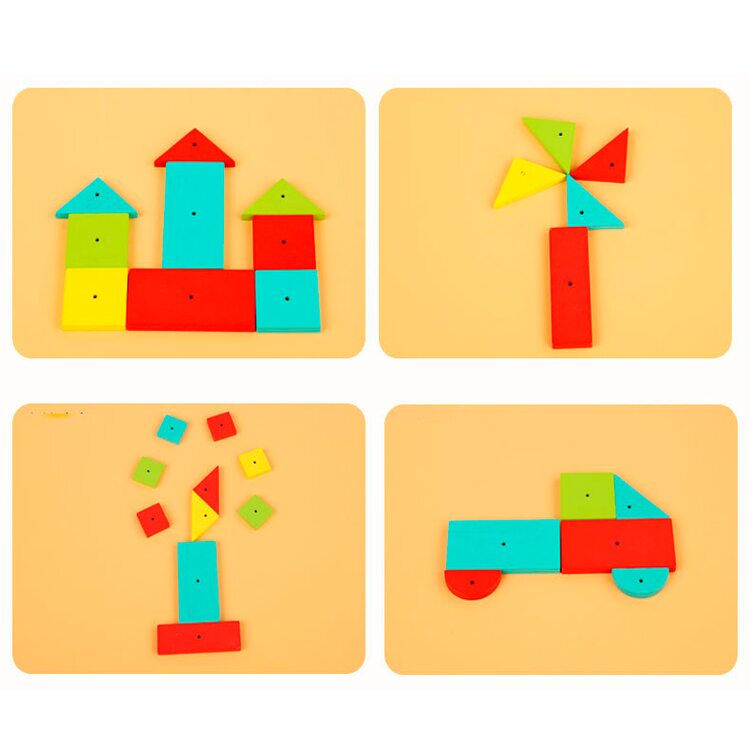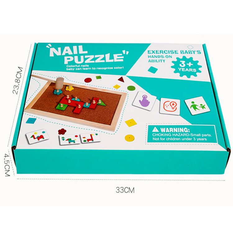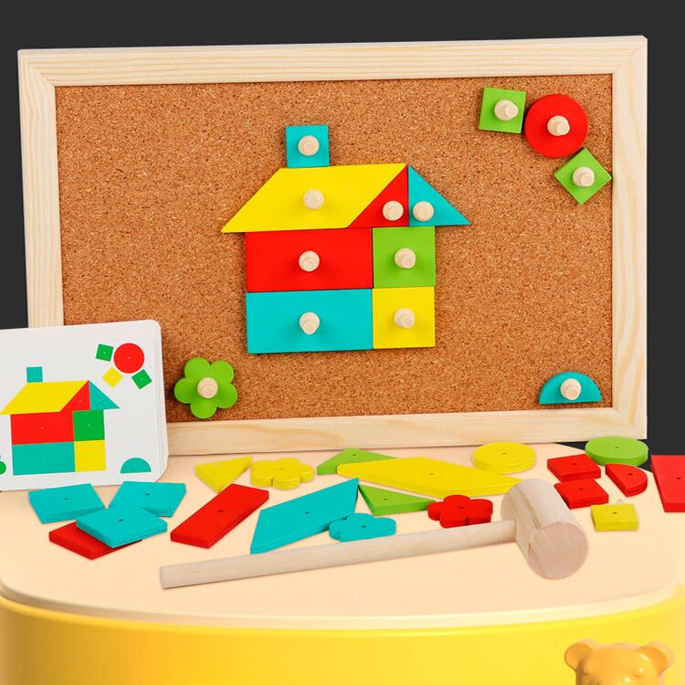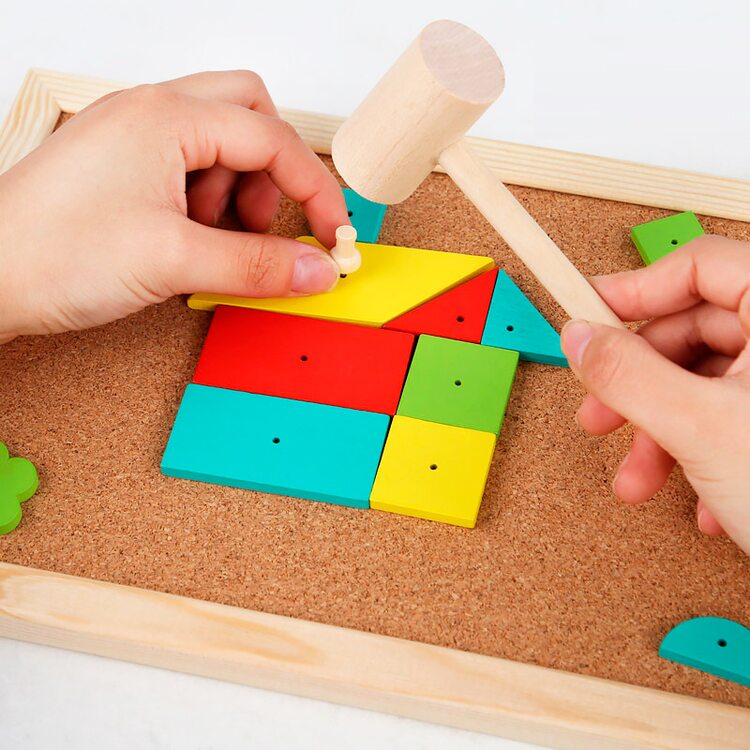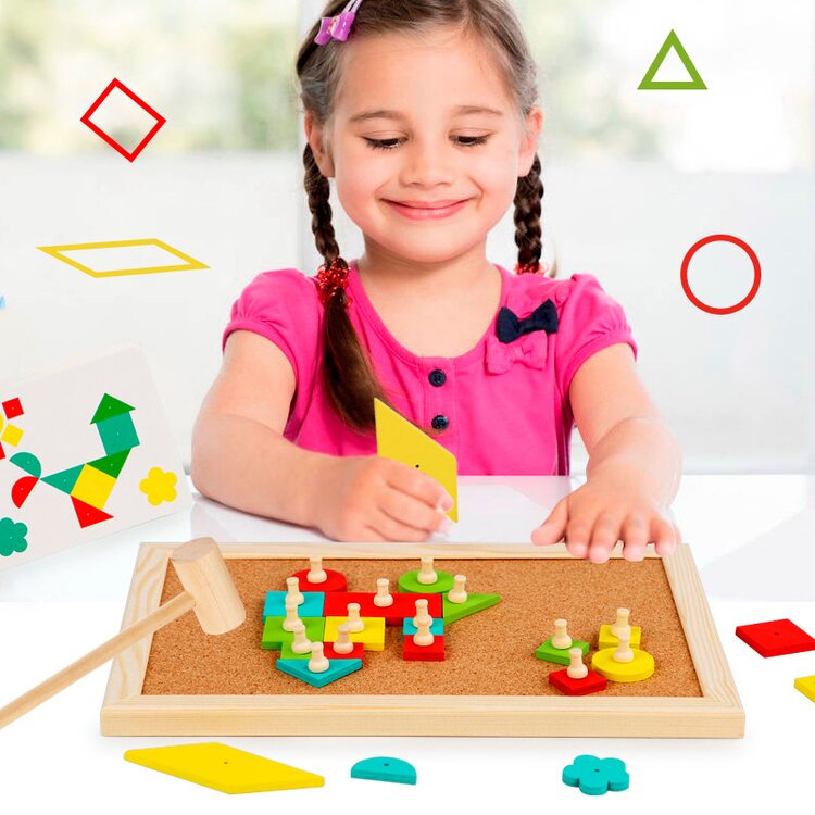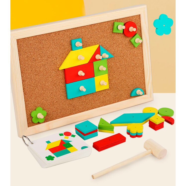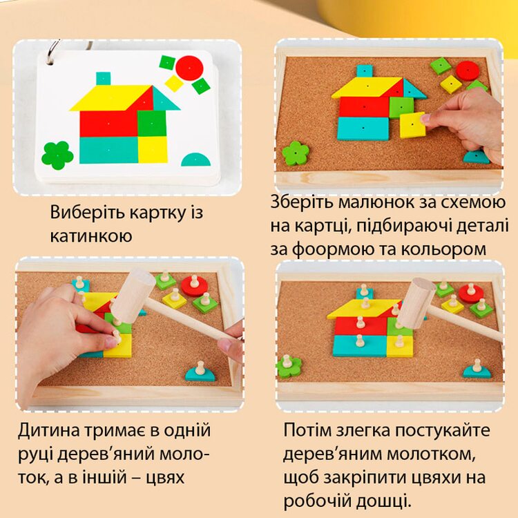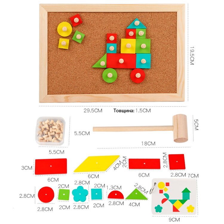 Набор для творчества с деревянными деталями, которые нужно выкладывать на корковое основание и фиксировать с помощью гвоздиков, которые забиваются с помощью молоточка. В набор входят 34 деревянных деталей, выполненных в виде различных геометрических фигур, 25 гвоздиков, молоток, рабочее поле и карточки со схемами (16 шт.).