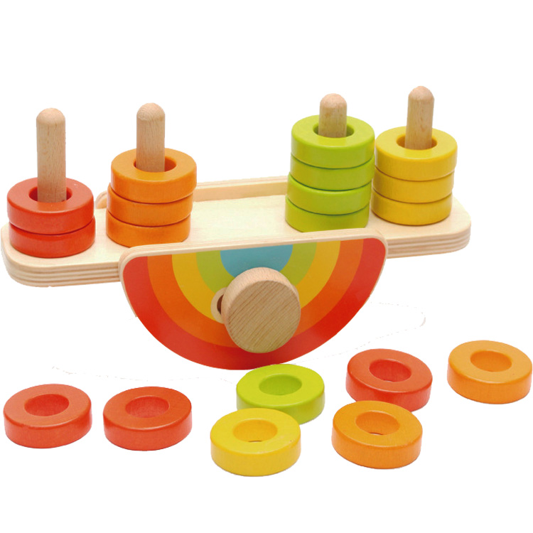Деревянные весы, где вместо гирь расположены разноцветные колечки. Играя, ребенок познакомится с понятиями "равновесие", "вес", "больше-меьше" и др.
