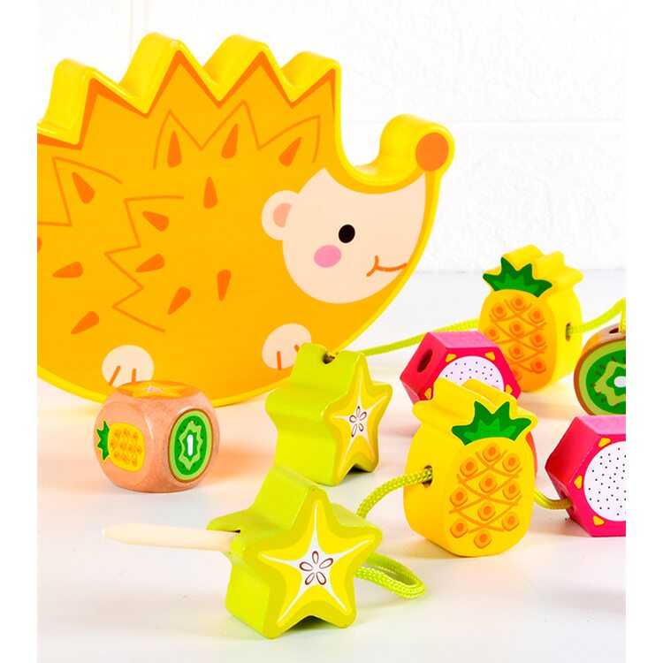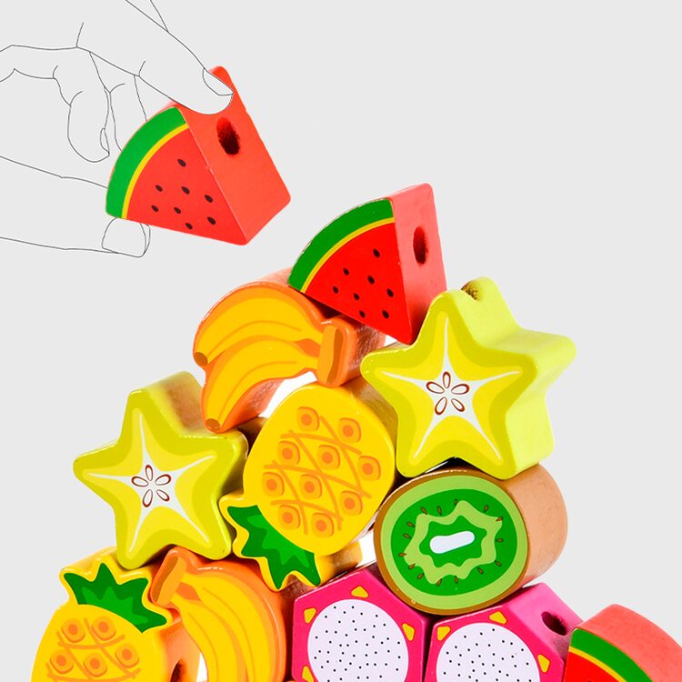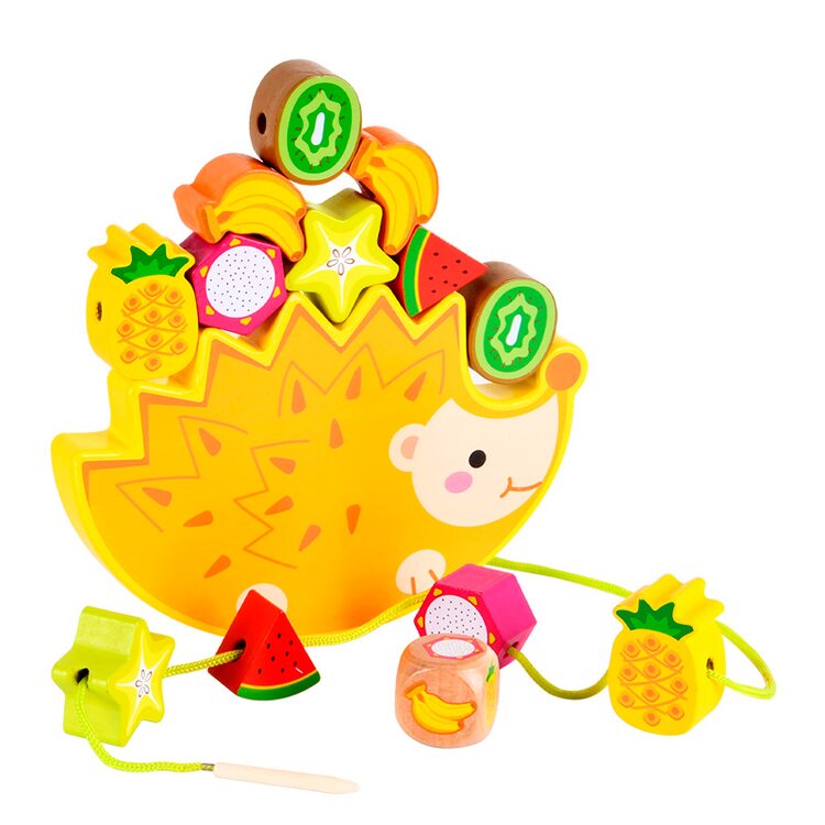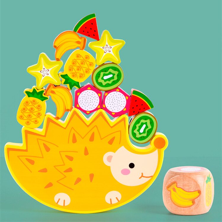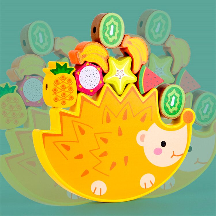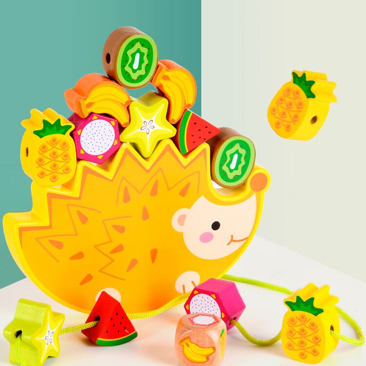 Игрушка представляет собой деревянное основание полукруглой формы в виде ежика, на которое нужно выкладывать различные фрукты и таким образом, чтобы ничего не упало. Прекрасная игра для развития координации движения. Также в набор входит шнурочек с деревянным наконечником, на который можно нанизывать детали балансира и получатся прекрасные фруктовые бусы.