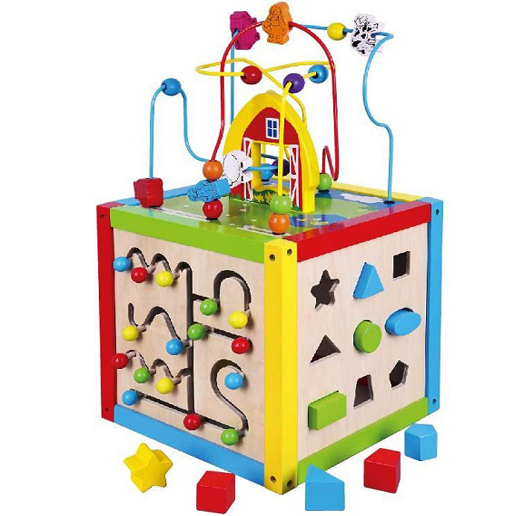 Развивающий куб для Вашего малыша. На гранях куба размещено 5 игр для раннего развития малыша: Пальчиковый лабиринт с разноцветными бусинками, деревянный лабиринт, грань с часами, сортер с деталями геометрической формы и доска для рисования мелом или можно сказать для творчества.