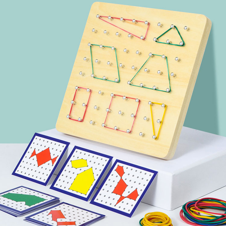 В набор входят карточки с заданиями, резиночки и геоборд с металлическими штырьками.