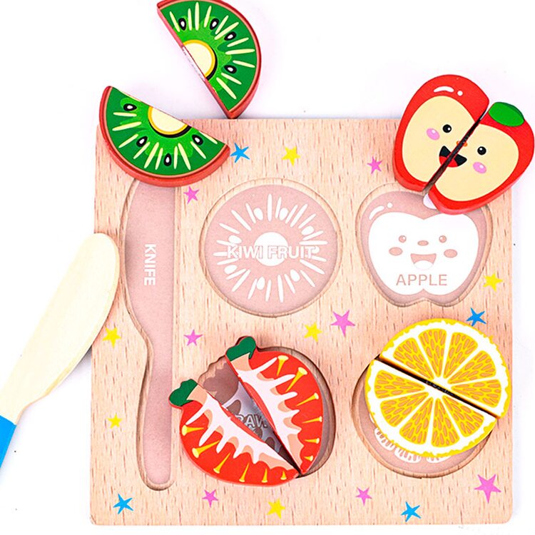 В наборе 4 фрукта, которые можно разрезать на две части с помощью деревянного ножа. Саму игру можно использовать как рамку-вкладыш.