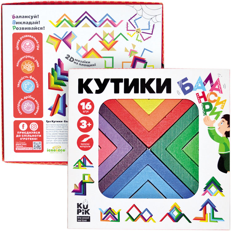 Головоломка «Цветные уголки» от ТМ Игротеко состоит из 16 разноцветных деревянных деталей – по 4 крупных, средних и маленьких уголка. В собранном виде они образуют квадрат. Детали свободно составляются между собой и на плоскости, и в пространстве. Чтобы разобраться в возможностях конструктора, в наборе (на коробке) предусмотрены наглядные картинки-«подсказки». По ним ребенок без труда соберет даже самые сложные фигуры-балансиры. Конструктором легко увлечь не только одного ребенка, но и целую дружную компанию. Проявляя фантазию и творческий подход, из ярких уголков можно собрать несчетное количество фигур.