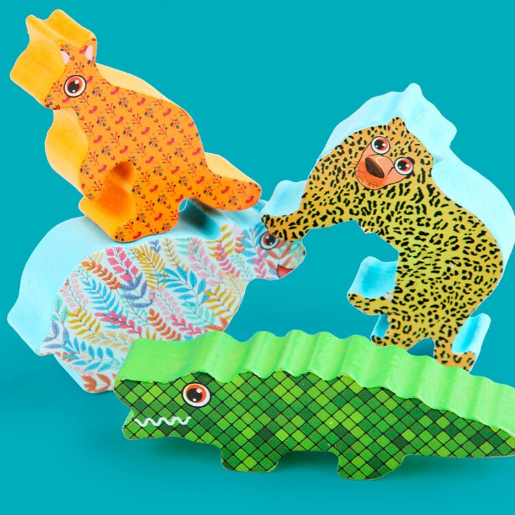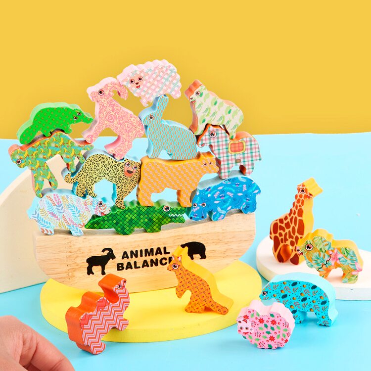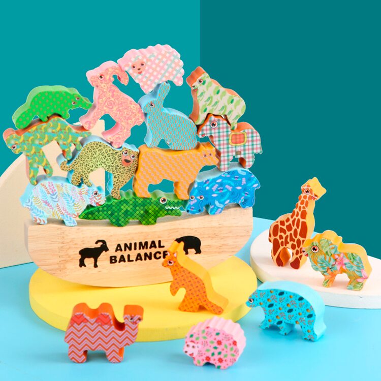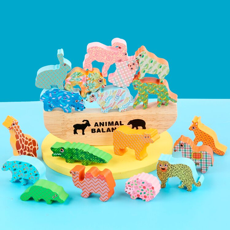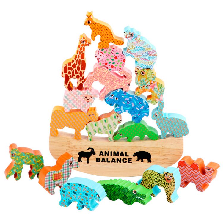 В комплект входят 18 животных и подставка для игры в балансир.