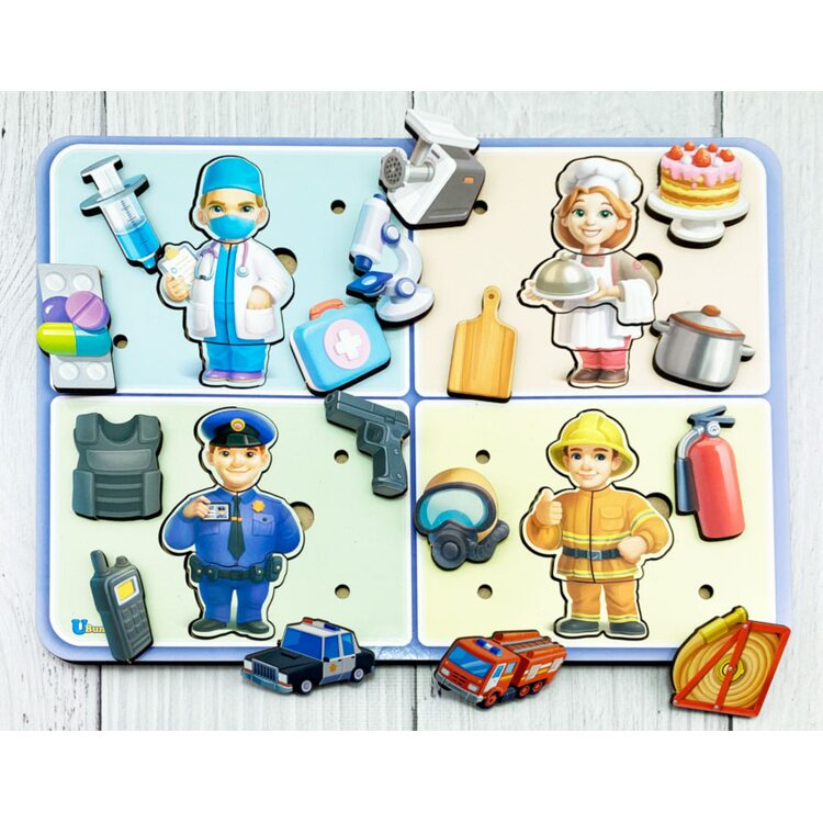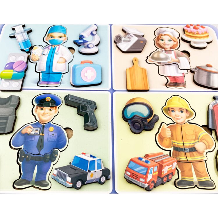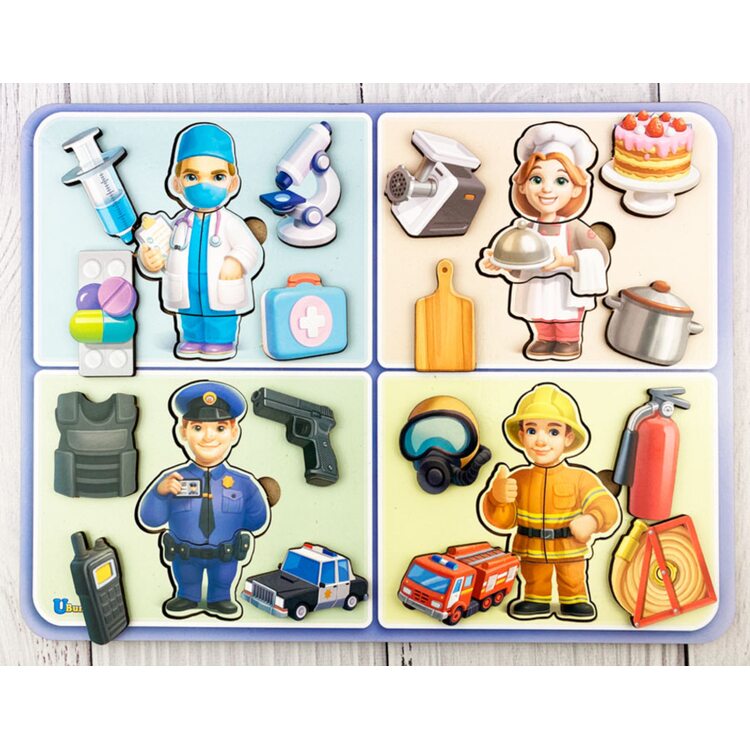 Набор пазлов (4 шт.), на которых нарисован человек определенной профессии: врач, повар, полицейский и пожарный. Каждый пазл состоит из 4-х частей, которые нужно правильно соединить, чтобы узнать к какой профессии относится человечек. В комплект также входят по 4 предмета, которые относятся к той или иной профессий, которые нужно расставить правильно, чтобы не получилось, что пожарный будет тушить огонь тортиком, а полицейский выполнять свои обязанности с помощью мясорубки. Смешно, не правда ль?
