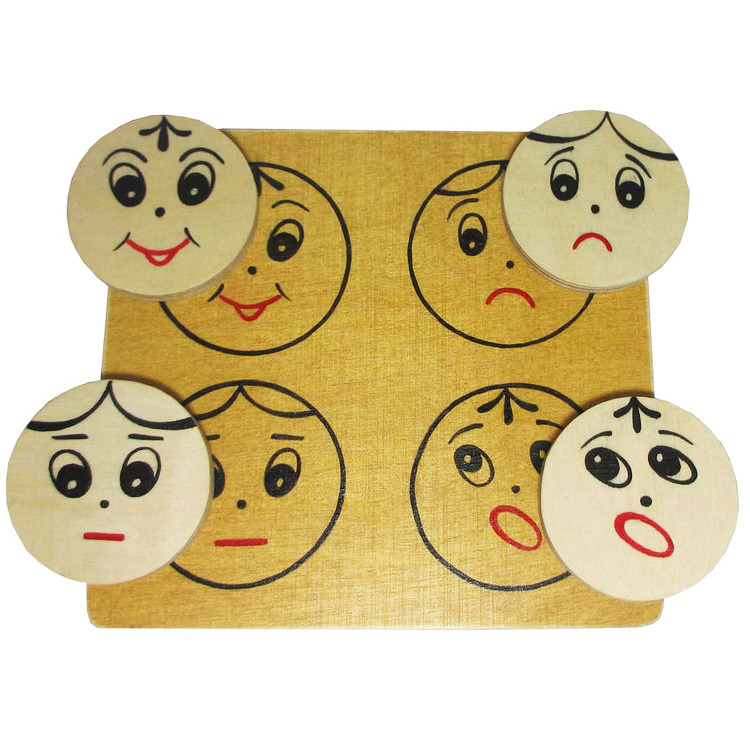 На досточке нарисованы разные эмоции на кружочках, всего 8 основных эмоций человека:радость, печаль, злость, удовлетворение и т.д. Игра поможет понять психологическое поведение ребенка и научить его различать виды эмоций от отрицательных до положительных.