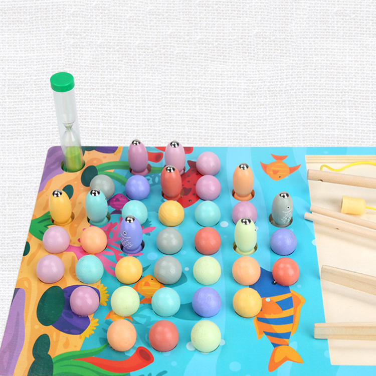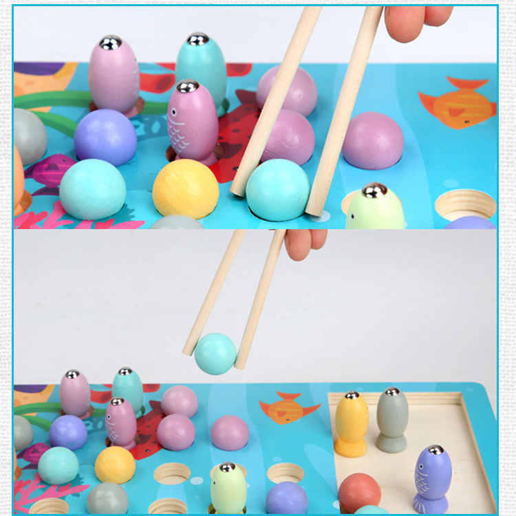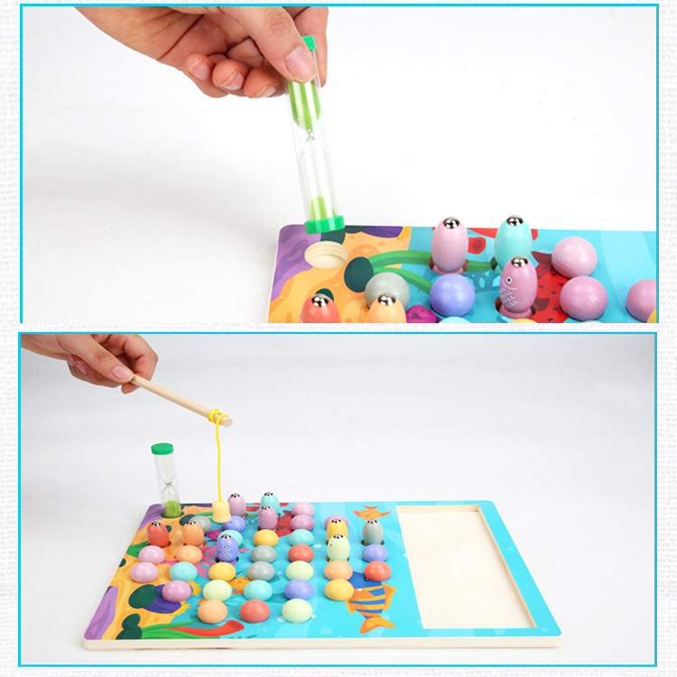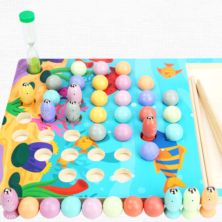 Прекрасная игра для развития моторики и координации движения. Ребенок не только ловит рыбки с помощью магнитной удочки, но и перемещает шарики с помощью разных инструментов: для начала можно пальчиками, затем с помощью щипцов, а потом и палочками. В набор входят песочные часы, с помощь которых можно проводить соревнования, кто быстрее и ловче соберет рыбок или шарики определенного цвета или цветов.