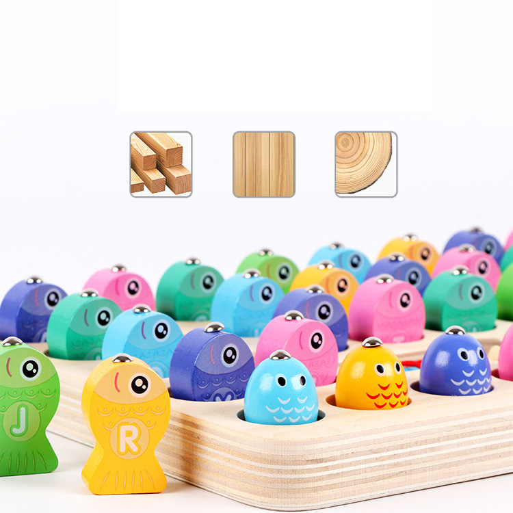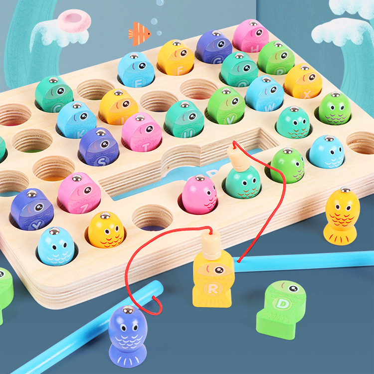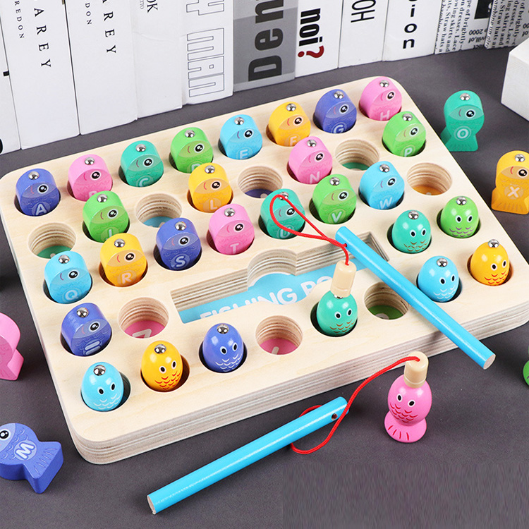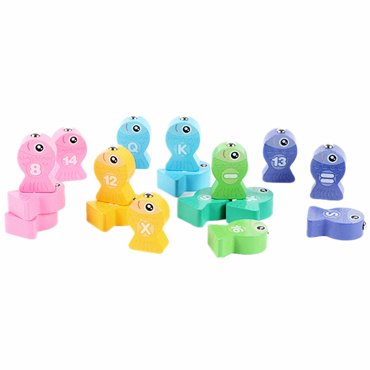 Рыбалка с двумя видами объемных рыбок. На одних рыбках нарисованы цифры, знаки и буквы английского алфавита, а на других - цифры от 1 до 10.