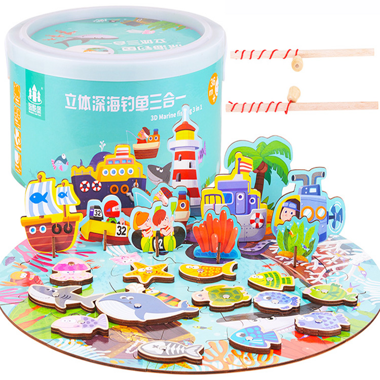 Игрушка 3 в 1: рыбалка с рыбками и удочками, пазл, 3D театр. Увлекательное приключения морскими глубинами ожидает юного моряка. Все детали пазла деревянные. Картинка пазла выступает сценой, подложкой для постановки морских приключений. Все персонажи, которые плавают по воде входят в комплект с подставками, а морские жители плавают под водой и оснащены металлическими кружочками, чтобы их можно было ловить на удочку.