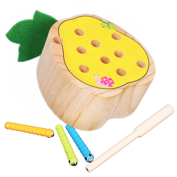 Старшее поколение помнит прекрасную игру рыбалку с пластиковыми рыбками, которых ловили на магнитную удочку. «Груша» - развивающая игрушка нового поколения. Она изготовлена из дерева. Фигурки цветных гусениц можно не только вынимать из деревянного основания, но и вставлять обратно. Таким образом у малыша несколько игр вместо одной! Происходит тренировка различных групп мускул, улучшается глазомер и координация.