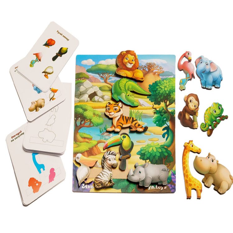 Логическая игра, которая познакомит ребенка с животными Африки, поможет разобраться в понятиях "горизонтально" и "вертикально". Игра состоит из планшета с изображением природы Африканских саванн с наклейными липучками горизонтально и вертикально, а также ярких представителей животного мира Африки - 14 животных и птиц.