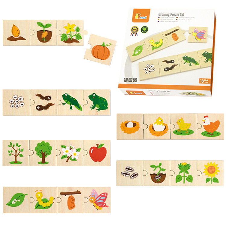 Оригинальную развивающую игрушку предлагает малышам и родителям компания Viga Toys. Пазловая игра «Трансформация» не просто развивает логическое мышление, но формирует у ребенка научное мировоззрение. Во время игры ребенок знакомится с этапами преображения живых существ и растений. Необходимо соединить пазлы с учетом логической последовательности. При этом отдельные элементы «цепочки» можно пропускать. Так поступают, если карапуз мал и не может соединить самостоятельно больше 2-х картинок.