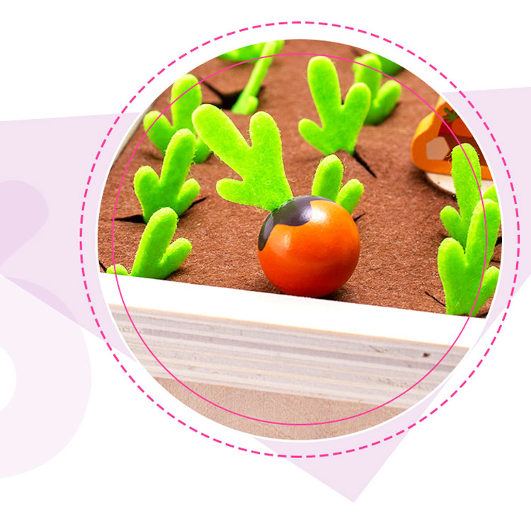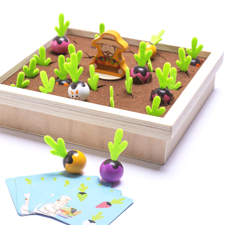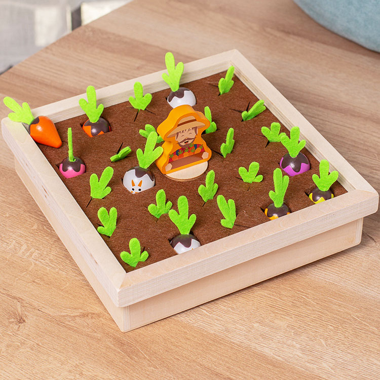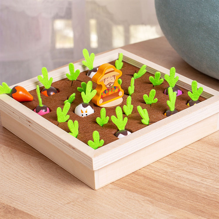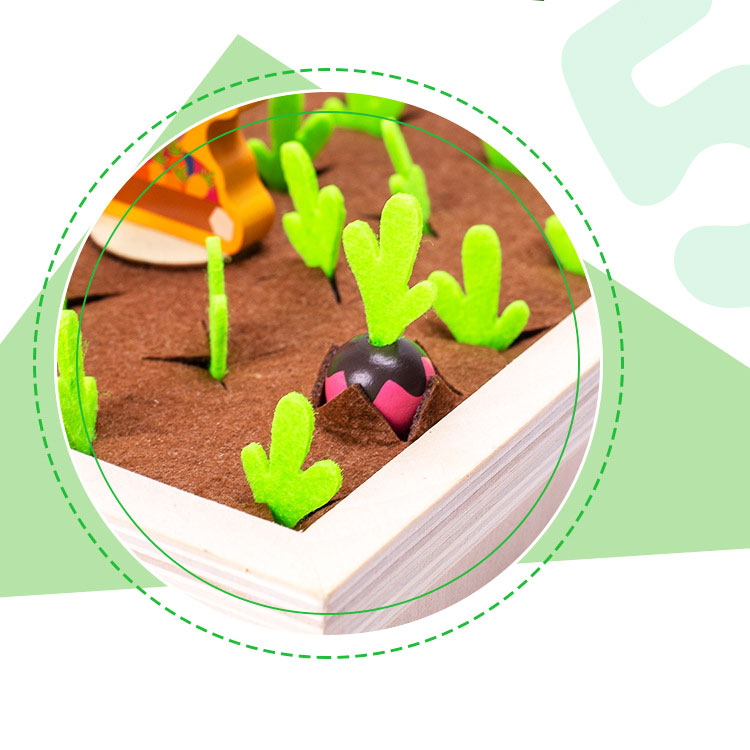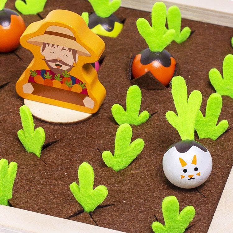 Играя, ребенок знакомится с овощами, развивает внимание и зрительную память, а также мелкую моторику. Овощи удобно сажать и вытягивать за фетровый (мягкий) хвостик.