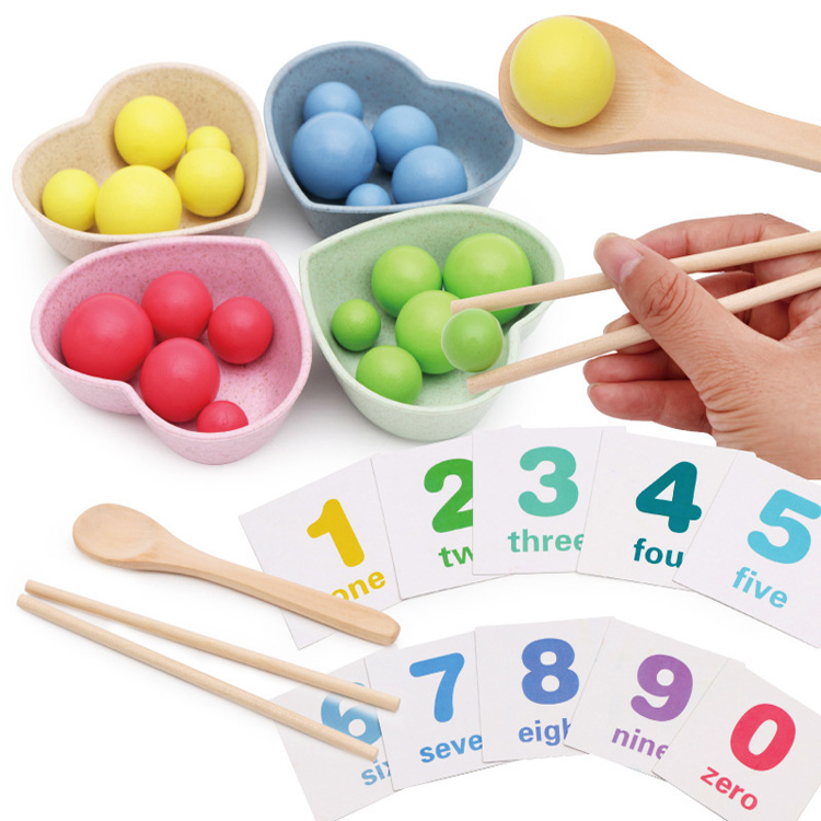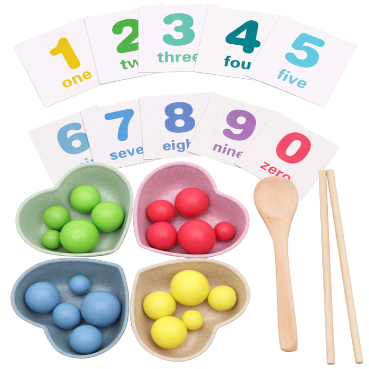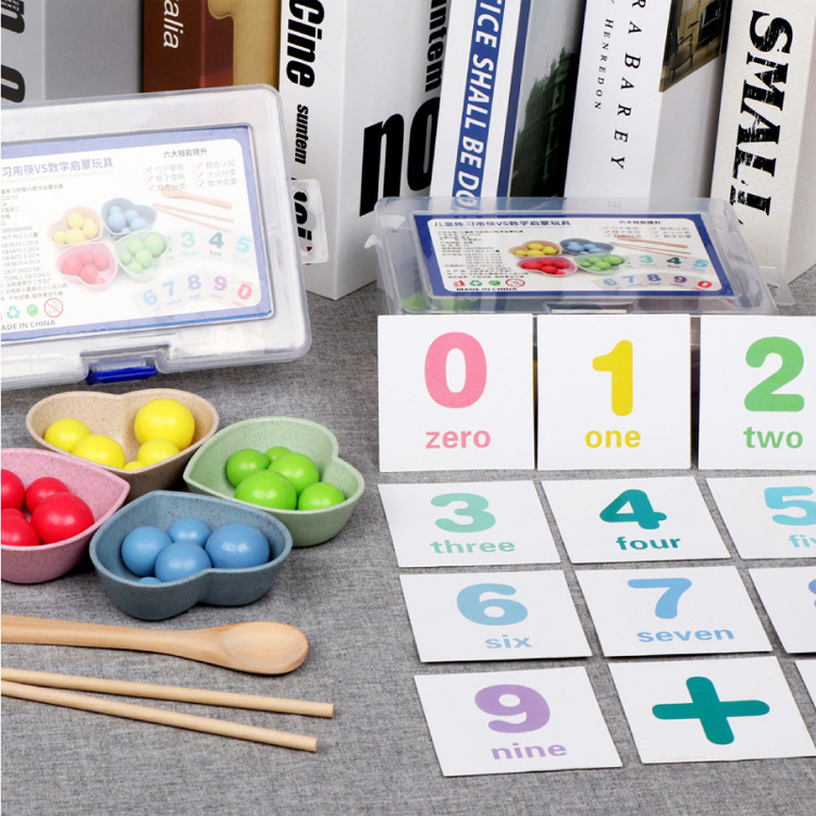 Комплектация: пластиковая коробка с замком для хранения, 4 тарелочки в виде сердца, 2 палочки, ложечка, 4 набора шариков по 5 шт. разного размера и цвета (розовый, жёлтый, салатовый, голубой), 12 двухсторонних карточек с цифрами, знаками и примерами.