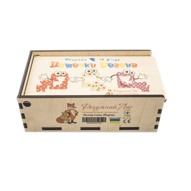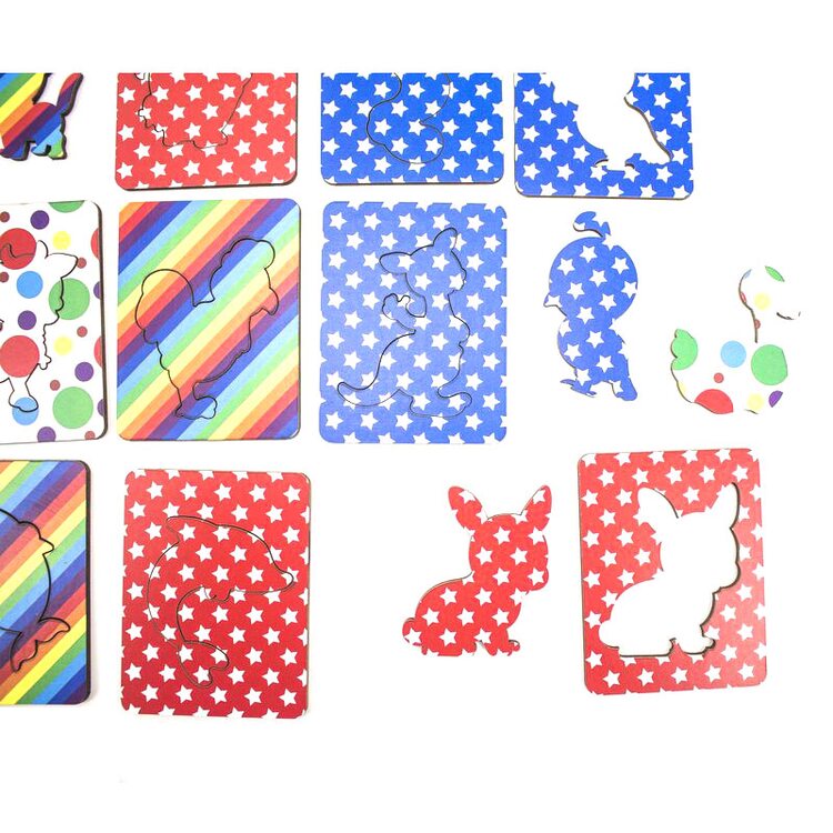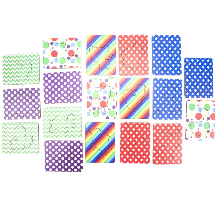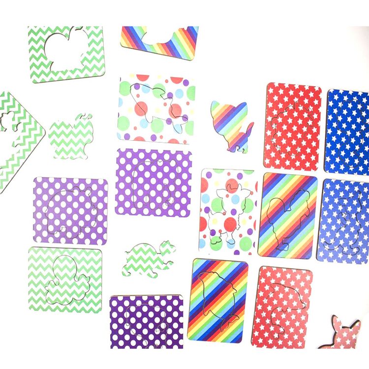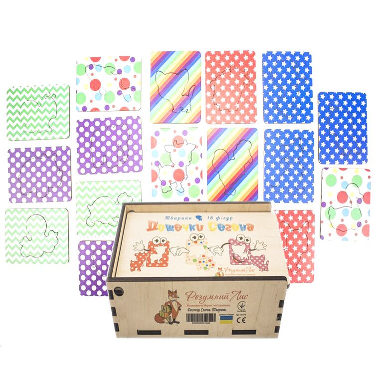 Досточки Сегена с различными узорами и вставкой в виде животного (18 фигур). Узоры на досточках повторяются, а вот силуэты животных нет и ребенку нужно определить где подходящая досточка (домик) для животного.