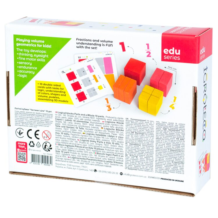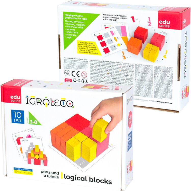 Логические кубики, которые объяснят детям простые закономерности о дробях. Множество предметов можно разделить на части, но как это называется, и что нужно сделать помогут карточки с заданиями и схемами - 10 двухсторонних карточек (20 заданий). В набор входят 4 кубика, которые разделены на 2, 3 и 4 части, а также целый кубик - 1 часть.