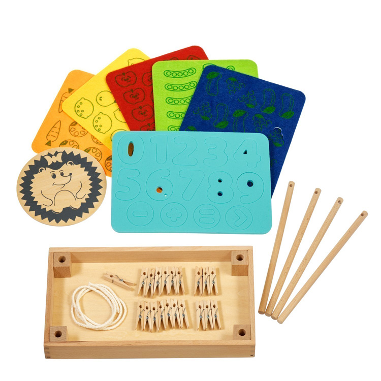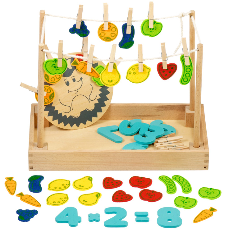 Комплектация: Круглая фигурка, на которой нарисован ежик, деревянное основание со столбиками и веревкой, деревянные прищепки - 20 шт., фрукты-овощи - 5 наборов из фетра, цифры от 0 до 9 и знаки «-», «+», «=», «<,>» из мягкого полимера.