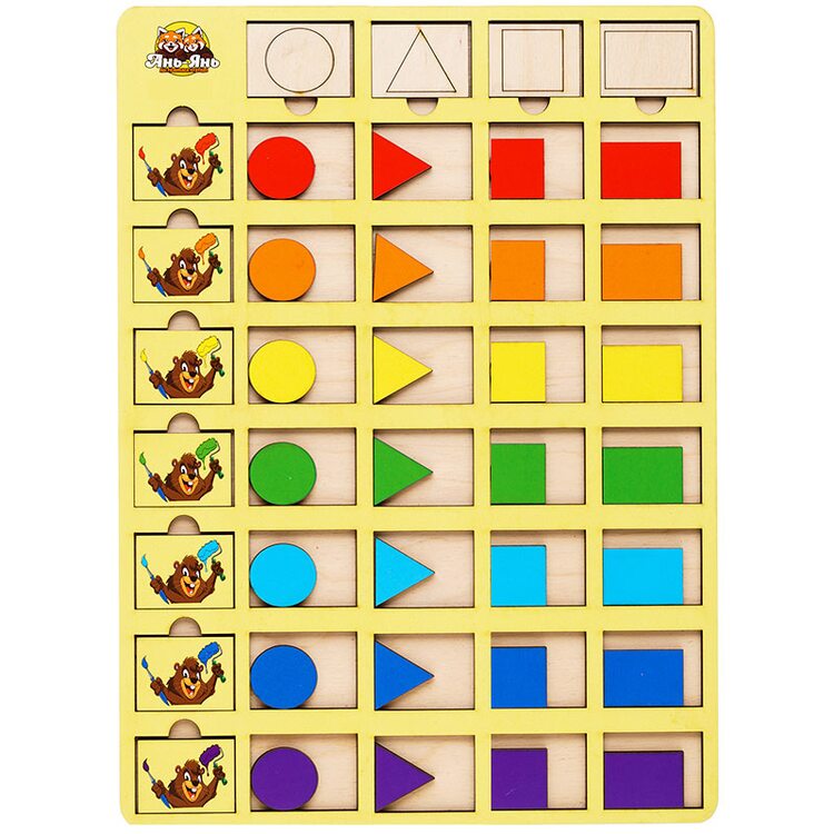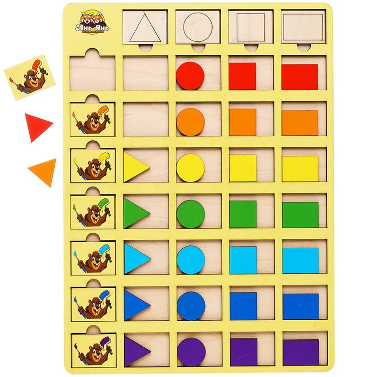 Легко и весело изучаем основные геометрические фигуры: треугольник, круг, квадрат, прямоугольник. В наборе 32 фигур 8-ми цветов (красные, оранжевые, жёлтые, голубые, зелёные, синие, фиолетовые, неокрашенные), а также фишки с нарисованными бобрами-малярами с кисточками тех же цветов, что и фигуры. Все фигуры можно менять местами, сортировать по виду или цвету, складывать в различные фигуры, узоры, также фигуры можно считать и тем самым тренировать счет. Знание приобретённые в процессе игры обязательно пригодятся ребенку как в детском садике, так и в младшей школе.