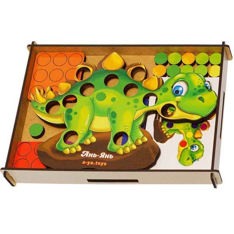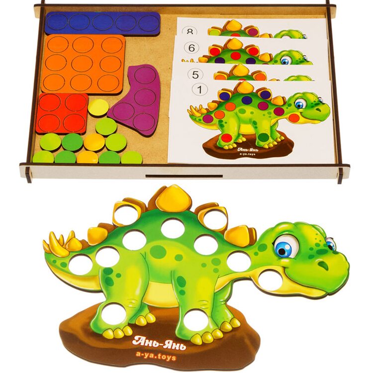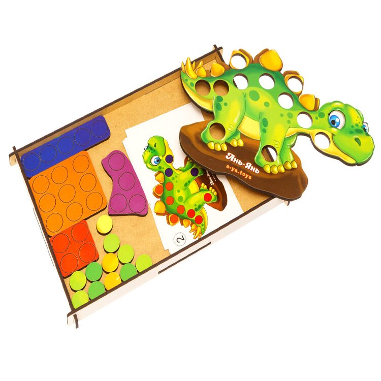 Мозаика в виде динозаврика с карточками-заданиями. Суть игры: нужно расставить цветные кружки согласно предложенному заданию на карточке.