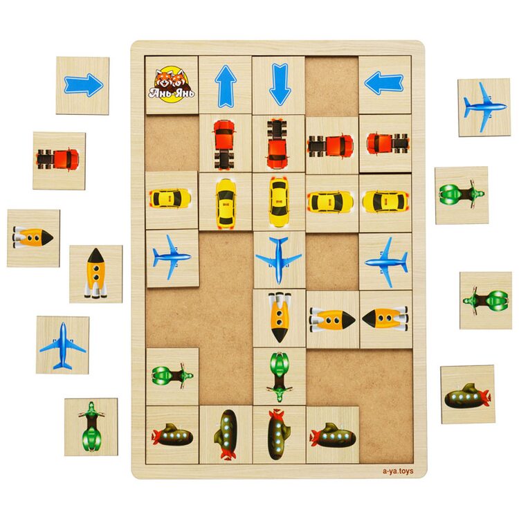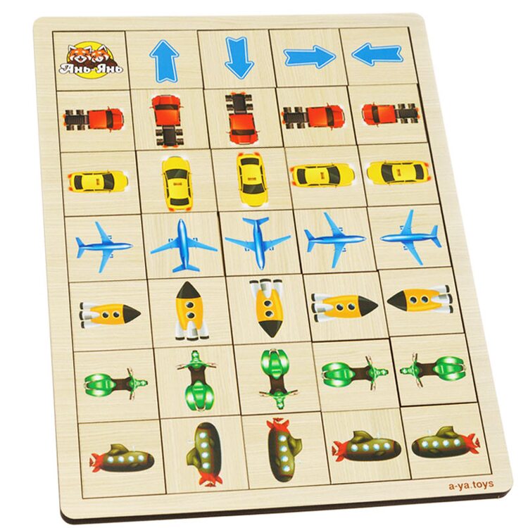 Знакомимся с понятиями, которое обозначают направления движения: вверх, вниз, вправо, влево. На деревянном планшете размещено 30 плашки с изображением различных видов транспорта (по 5 шт. каждого вида): КамАЗ, такси, самолет, ракета, мотороллер, подводная лодка, а также 4 плашки с изображением стрелочек, которые и будут указывать направление.