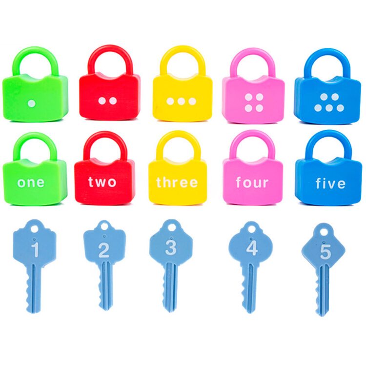 Набор пластмассовых замочков с ключиками. Всего в наборе 10 цветных замочков и 10 ключиков. Каждый замочек подписан цифрами на английском языке: one. two...nine, ten, а также нарисованы белые точечки, количество которых соответствует номеру замочка от 1 до 10. Ключик очень легко найти, если ребенок уже знает цифры, так как каждый ключик пронумерован и подходит только к одному замочку.
