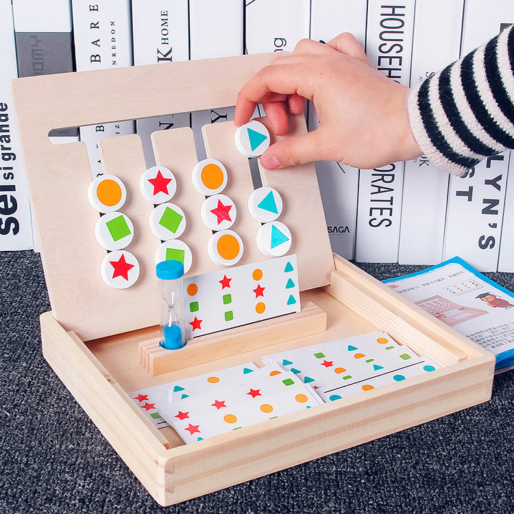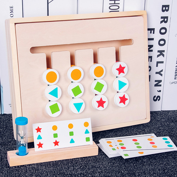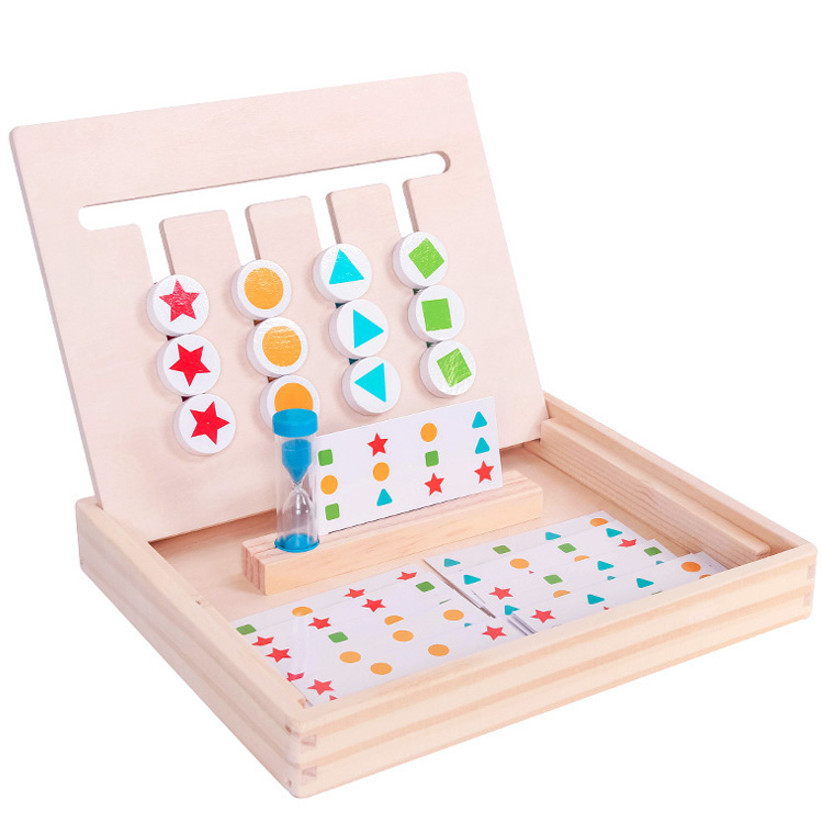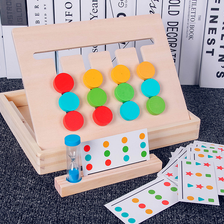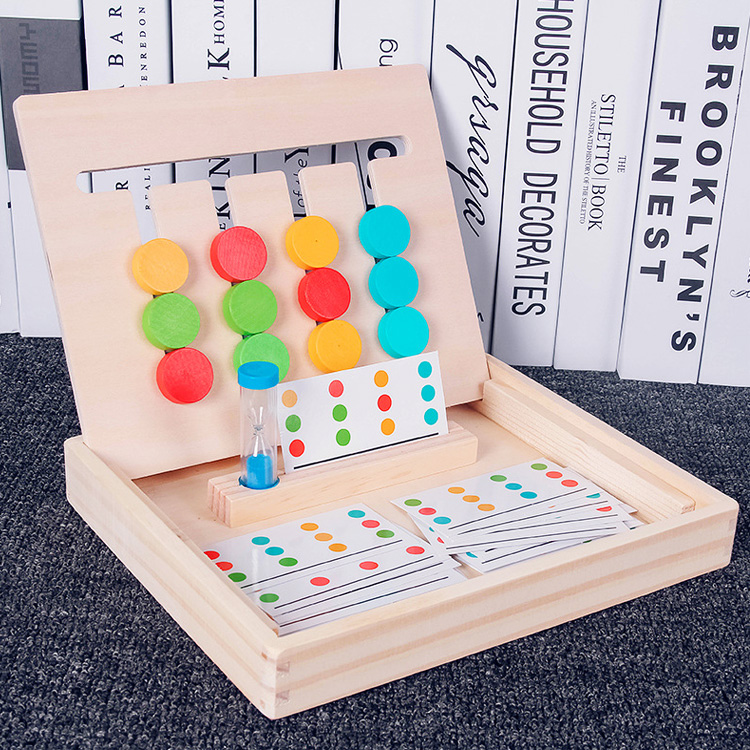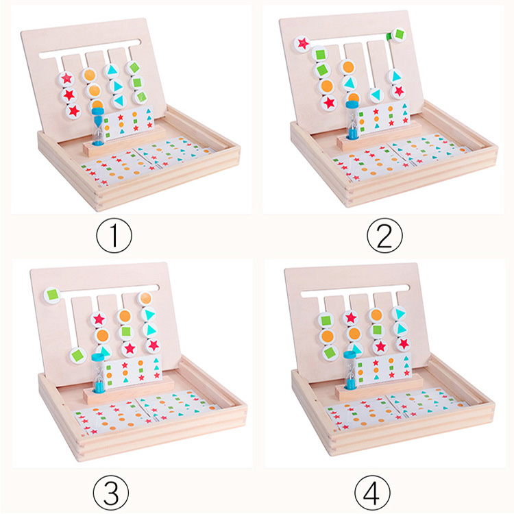 Комплектация: удобна платформа с передвижными деталями, которая вставляется в ячейки на основании, подставка под карточки, двухсторонние карточки с заданиями - 14 шт., песочные часы.