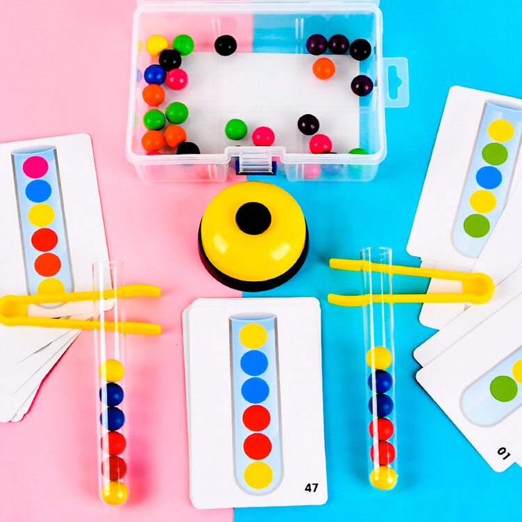 Игра-моторика с цветными шариками, схемами, щипцами, колбочками и колокольчиком. Развиваем мелкую моторику, знакомимся с цветами, выполняем задания по карточкам (цветовым схемам). С помощью пинцета нужно выкладывать цветные шарики в прозрачную колбу согласно задания на карточке.