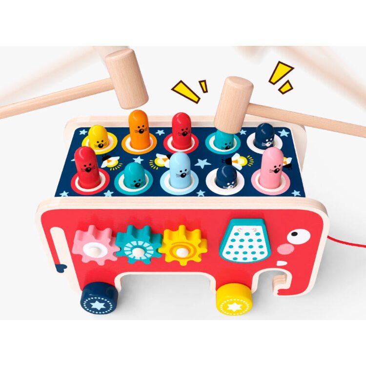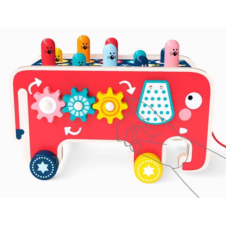 Развивающий мини-центр для Вашего ребенка. Игрушка выполнена в виде красочного слоненка в голубом и красном цвете. Слон подготовил для малыша сразу 4 игры: стучалка с хомячками и молоточками, разноцветный металлофон, каталка на ниточке, игра с шестерёнками.