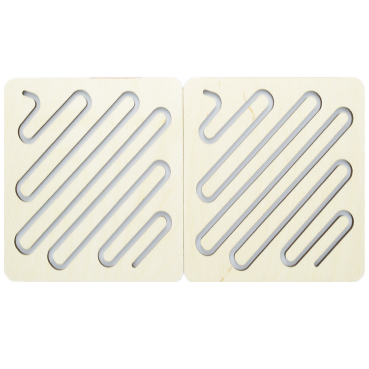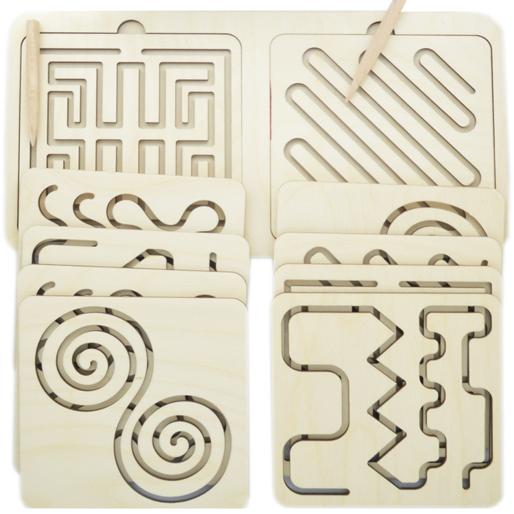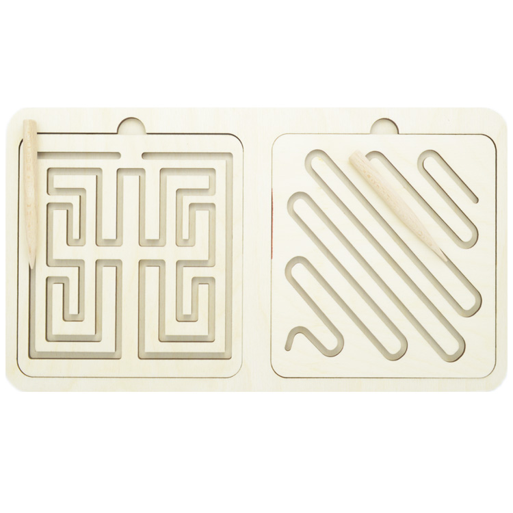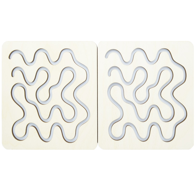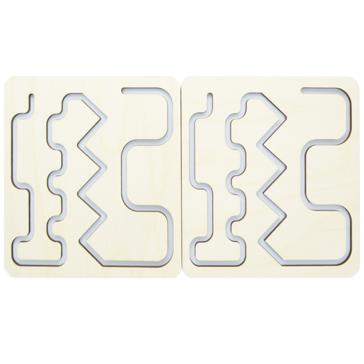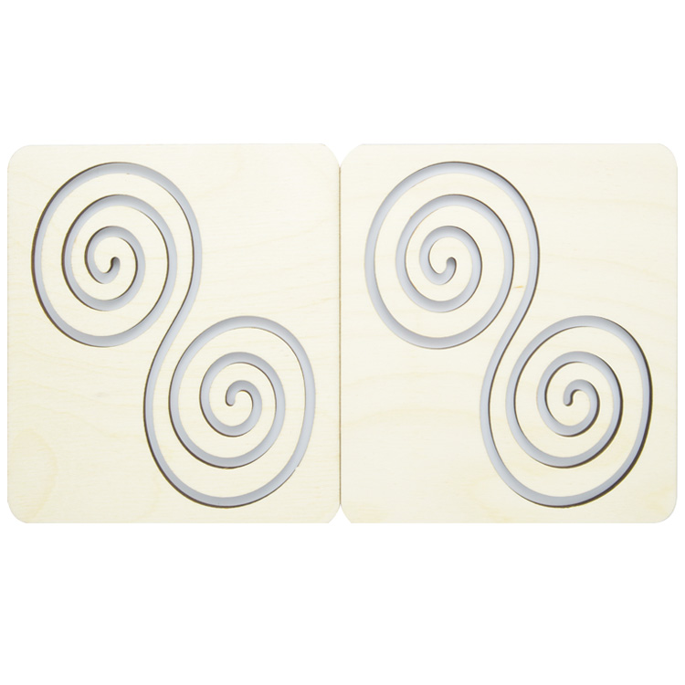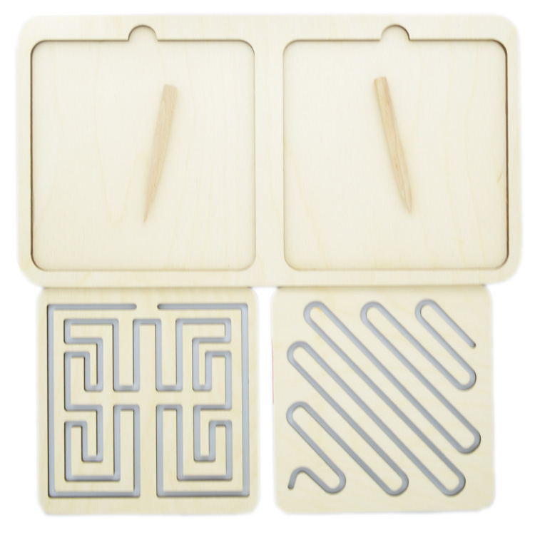 Набор для развития сразу двух полушарий мозга. Ребенок учится одновременно работать двумя руками. На деревянном основании расположено трафареты-вкладыши с одинаковыми рисунками. С помощью деревянных стилусов нужно одновременно и левой, и правой рукой проводить по рисунку.