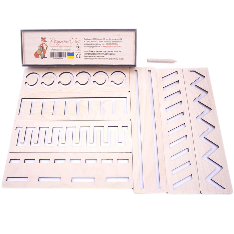 Пособие представляет собой набор линеек в виде трафаретов с различными схемами для рисования: зигзаги, волны , полукруги, штрихи, прямые линии, косые линии и др. С помощью таких трафаретов, Ваш ребенок, подготовит руку к письму, научится точности движений, правильного охвата ручки, карандаша или стилуса. Набор состоит из 7 "Умных линеек" и деревянного стилуса. Комплект дополнен удобной деревянной коробкой для хранения.