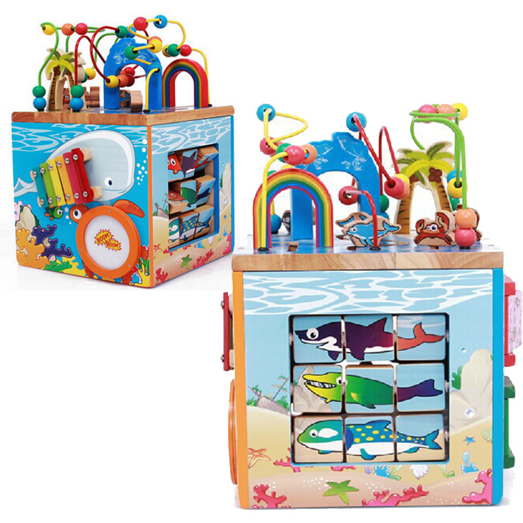Многофункциональная игрушка для раннего развития ребенка. Игрушка выполнена в морском стиле с красочными подводными жителями. На гранях куба разместились деревянный и пальчиковый лабиринты, деревянные счеты-пазлы, музыкальные инструменты, знакомство с рыбками. Окунитесь в мир развивающих приключений.