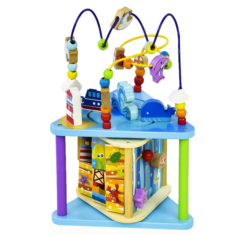 Развивающий центр со множеством игр для Вашего непоседы. Ваш ребенок может играть пальчиковым и деревянным лабиринтами с деталями морской тематики, мини пазлами, разноцветными счетами. Подарите радость малышу!