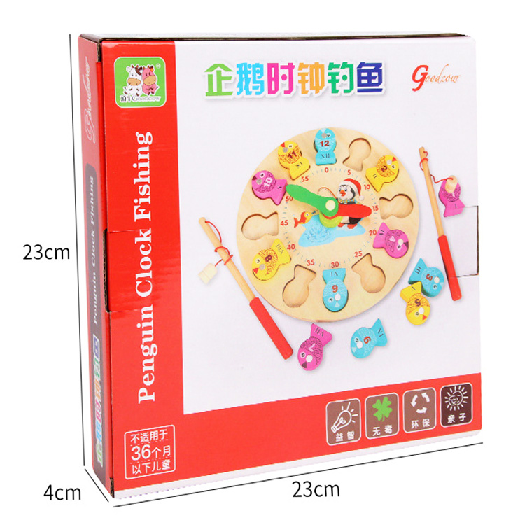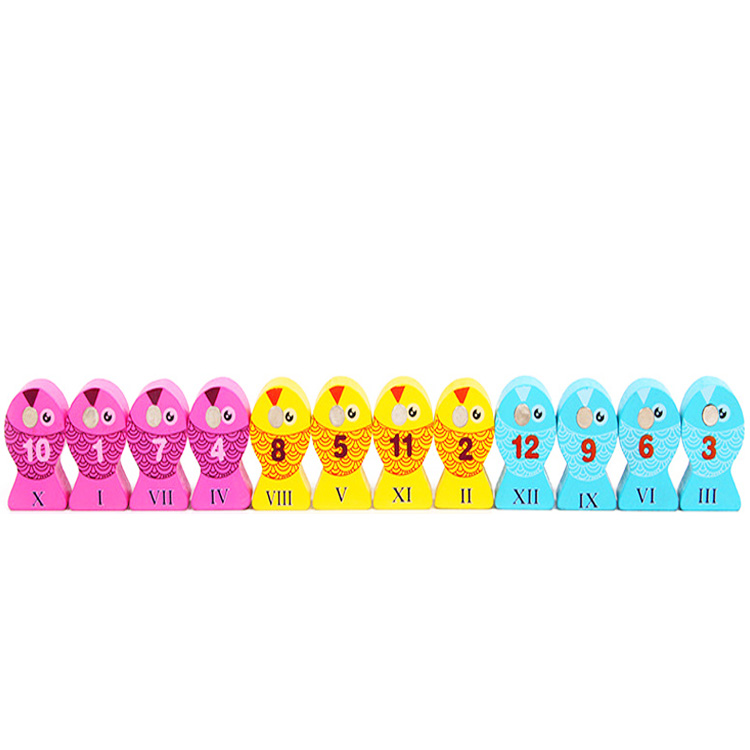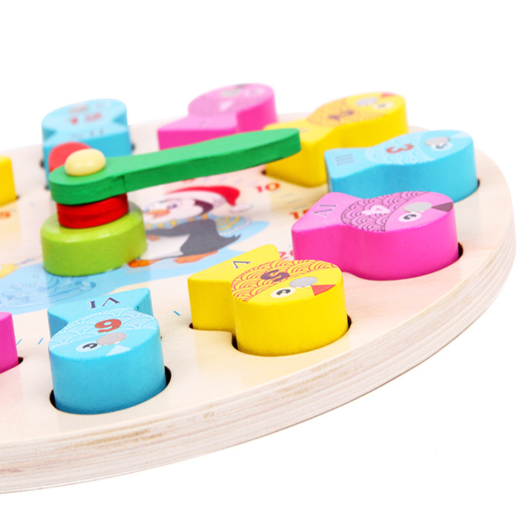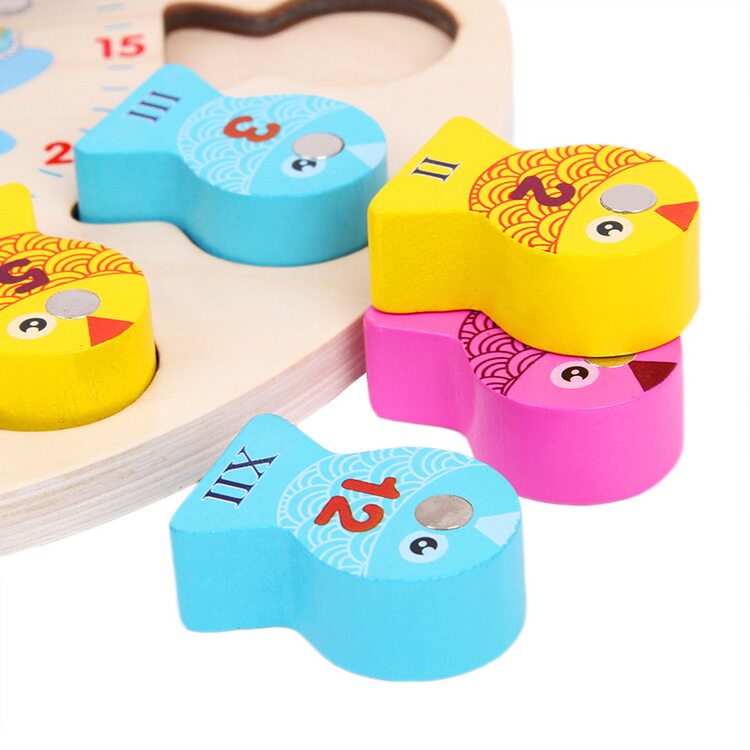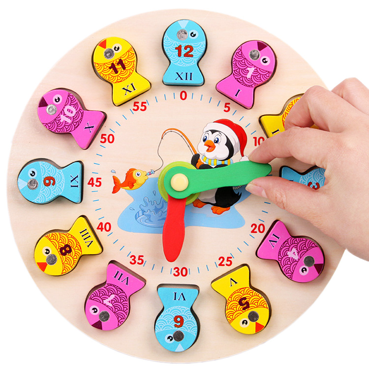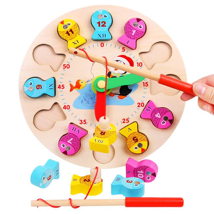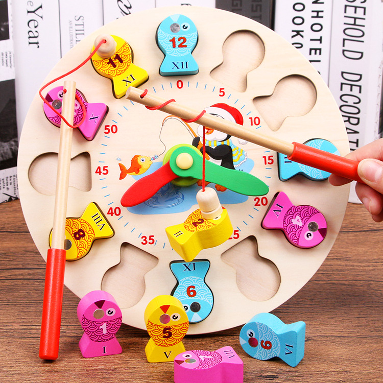 Деревянная рыбалочка с объемными рыбками и прудом в виде часов со стрелочками. Рыбки также выполняют роль циферблата с Римскими цифрами. В комплект входят: часы, рыбки 12 шт., две удочки с магнитиком.