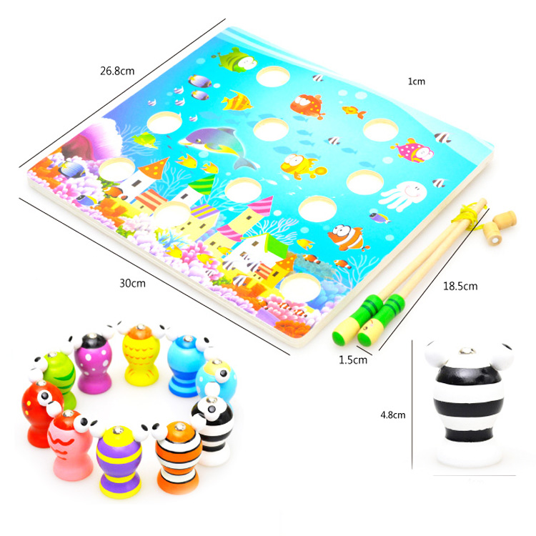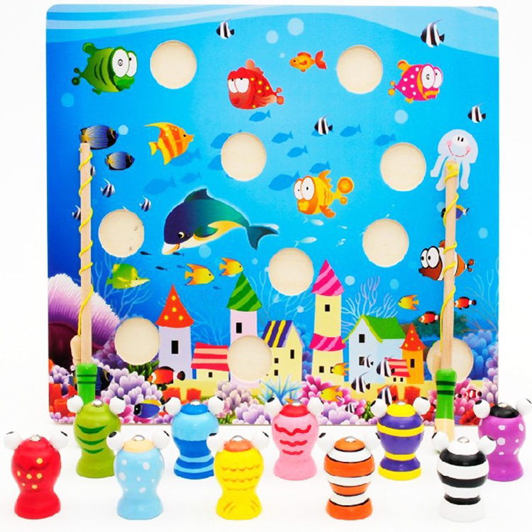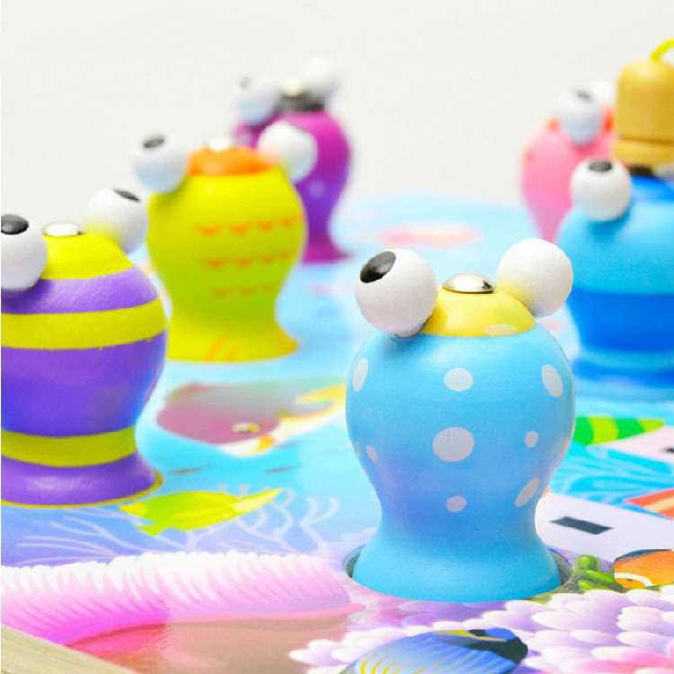 Рыбалка на разноцветных лягушек. В наборе деревянная основа в виде морского дна, 10 разноцветных жабок и 2 удочки. С такой игрой можно и устроить состязания.