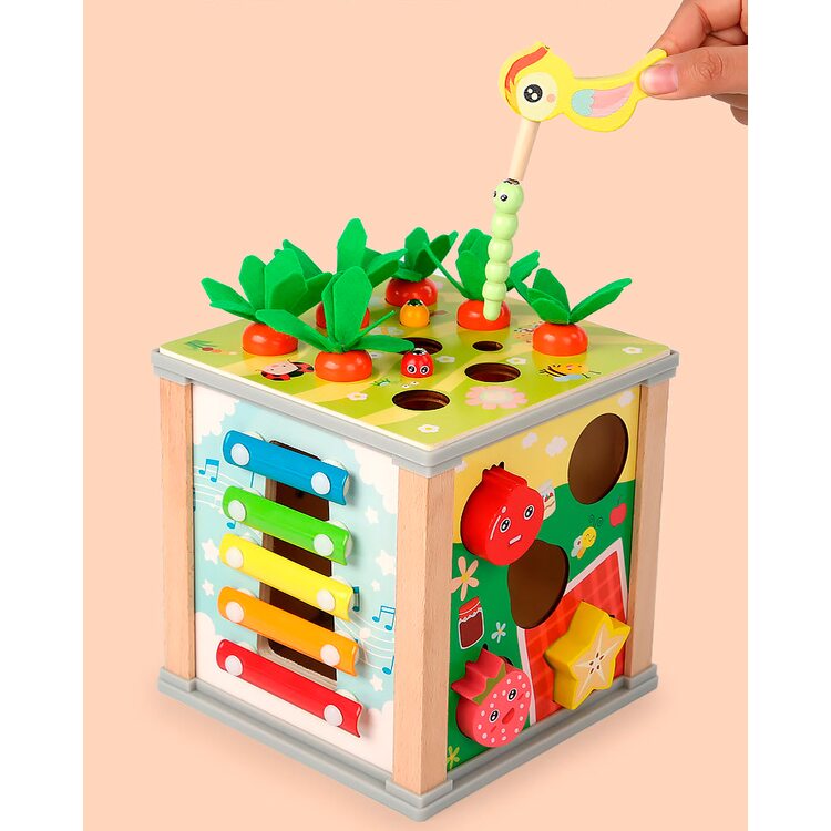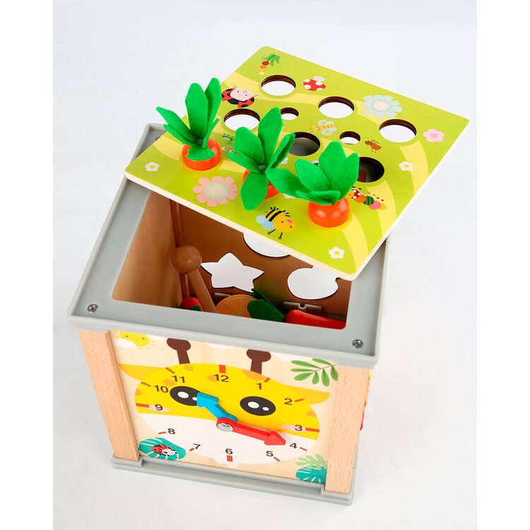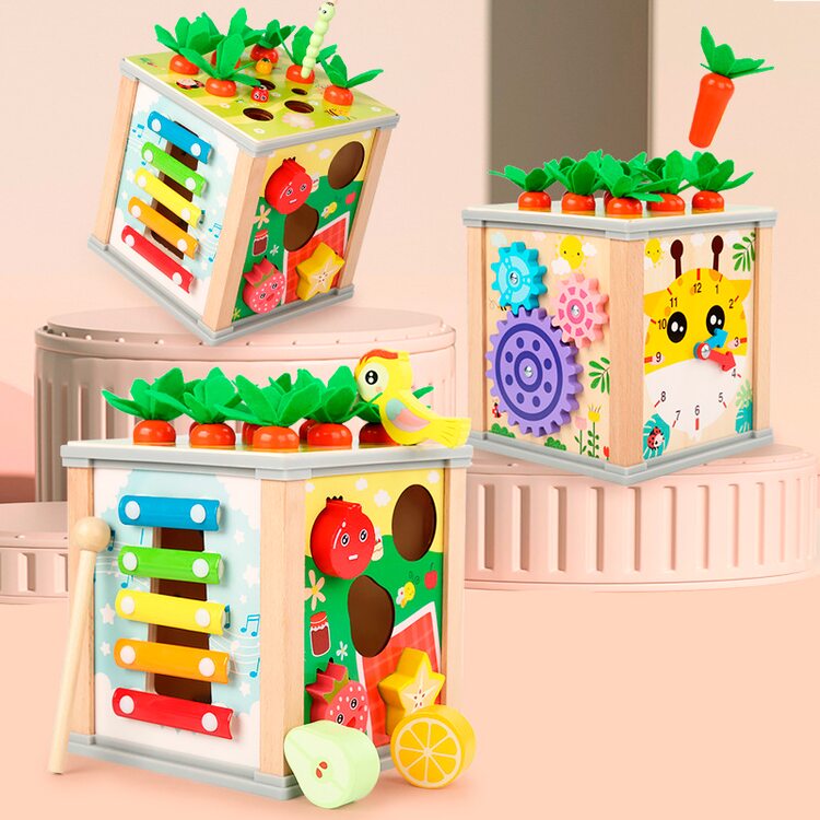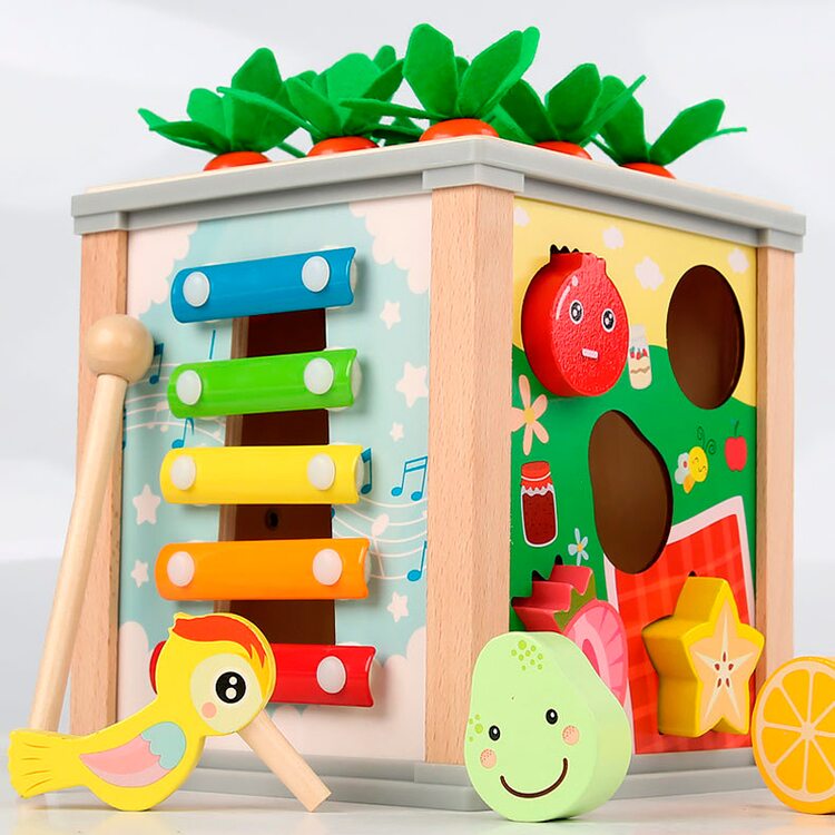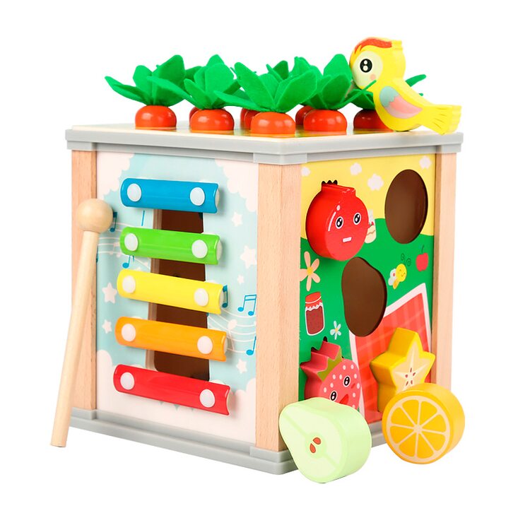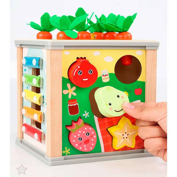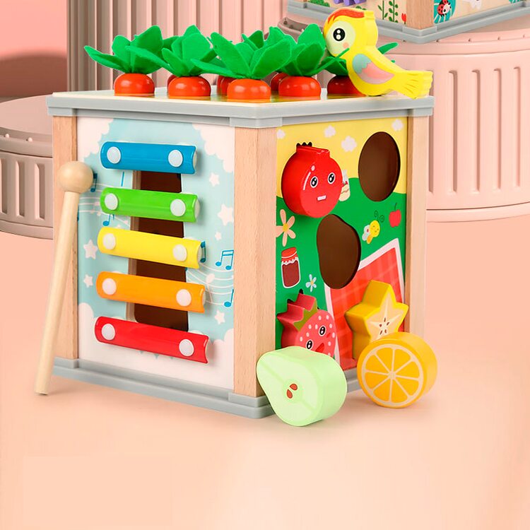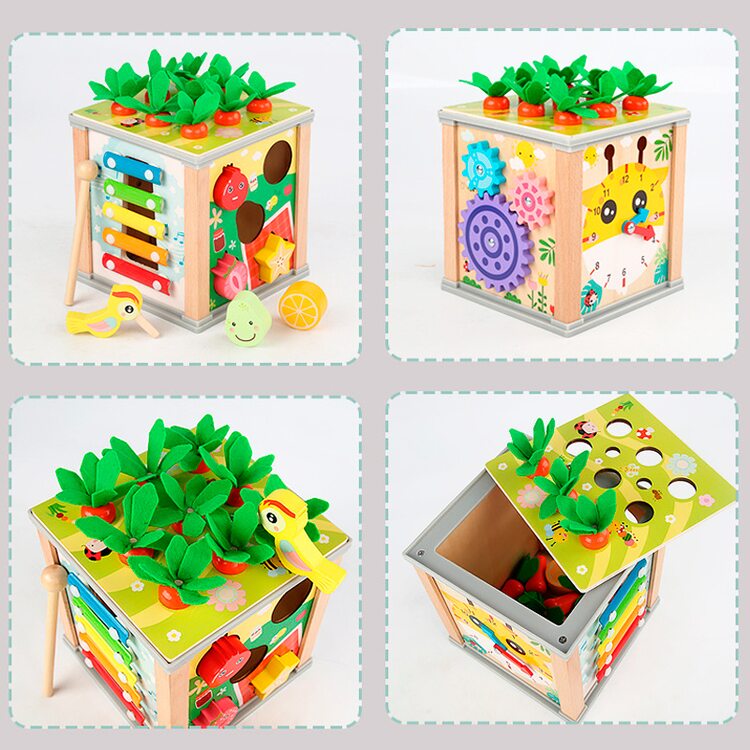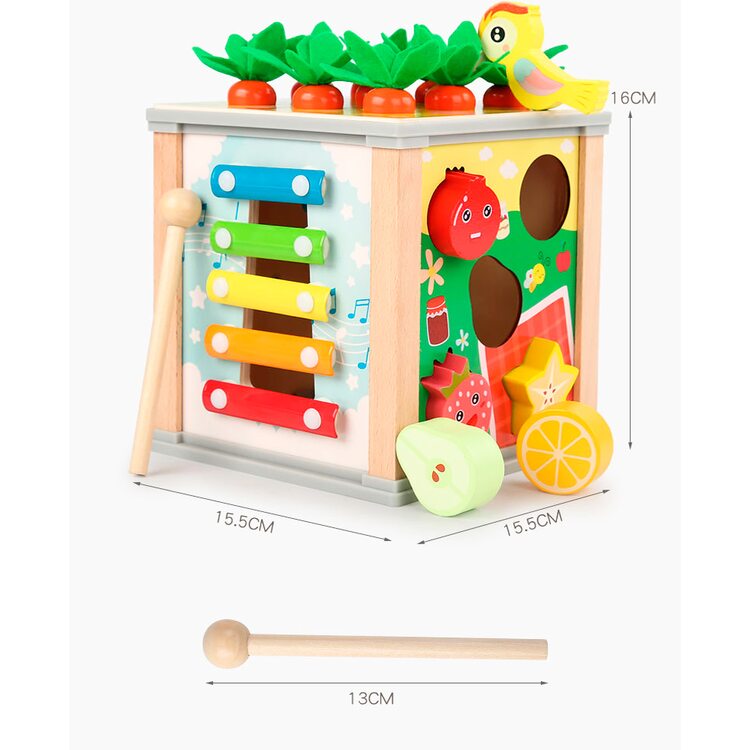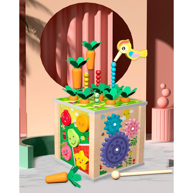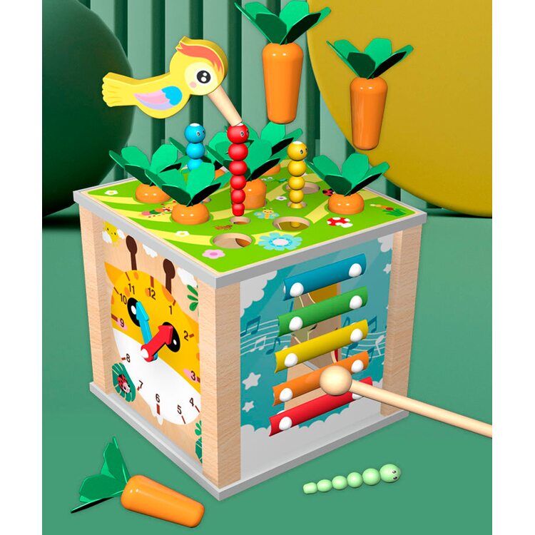 Всеосяжный кубик состоит из шести развивающих и обучающих игр, каждая из которых интересна, увлекательна, а также способствует более активному обучению и развитию. Рассмотрим основные элементы несколько подробнее. Металлофон 5 тонов поможет развить слух и музыкальное восприятие. Вылавливая цветных гусеничек развиваем мелкую моторику. Игра с морковками поможет научится считать в пределах 9-ти. Благодаря счетам ребенок сможет быстрее научиться считать. Для детей более старшего возраста находкой станут часы, благодаря которым ребенок научится распознавать и угадывать время. И в качестве последнего элемента выступают объемные фигурки в виде 5-ти фруктов и ягод. Одним словом, одна игрушка способна заменить шесть развивающих и обучающих игр. Ваш ребенок несомненно оценит эту игрушку по достоинству и будет с ней часто играть, гармонично развиваясь и обучаясь.