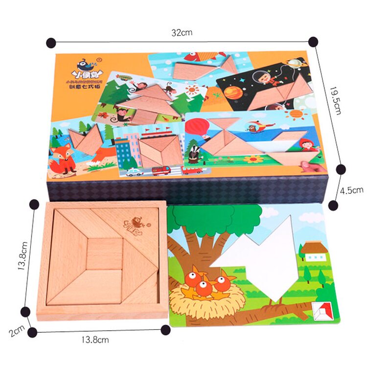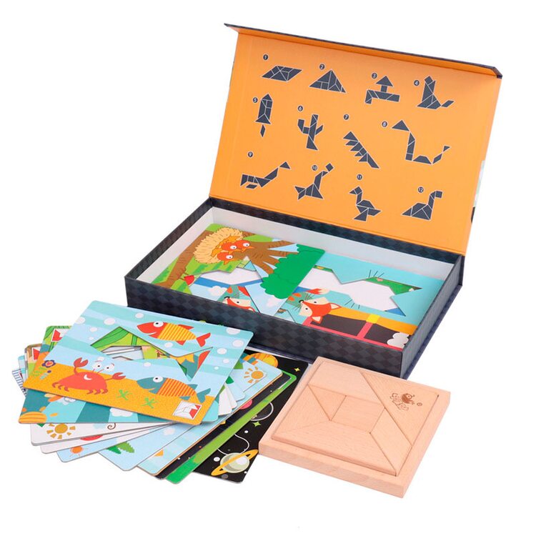 Танграм упакован в удобную картонную коробку. В комплект входят карточки с заданиями с размерами фигур 1:1.