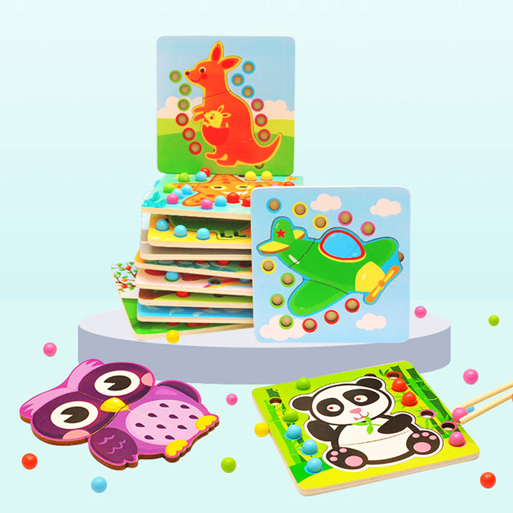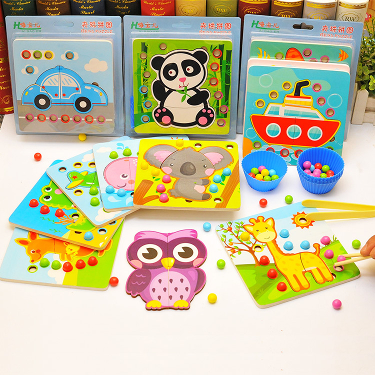 Игрушка 2 в 1 - пазл в виде различных животных или транспорта с цветными шариками для развития мелкой моторики. Для начала предложите ребенку сложить пазл, затем используя щипцы или палочки выложить шарики в ячейке, которые совпадают с цветом самого шарика.
