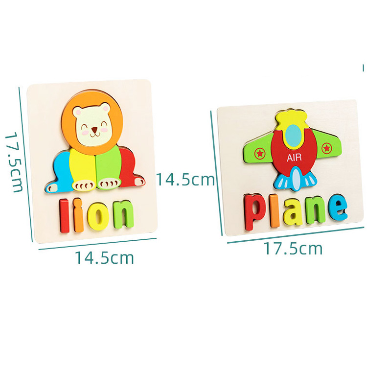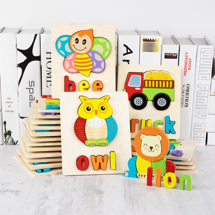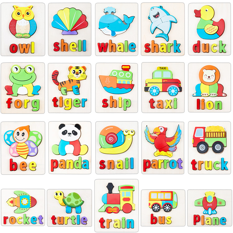 Пазлы с объемными деталями в виде различных животных, видов транспорта. Помимо самой картинке на основании размещена надпись на английском языке - название животного или транспорта.